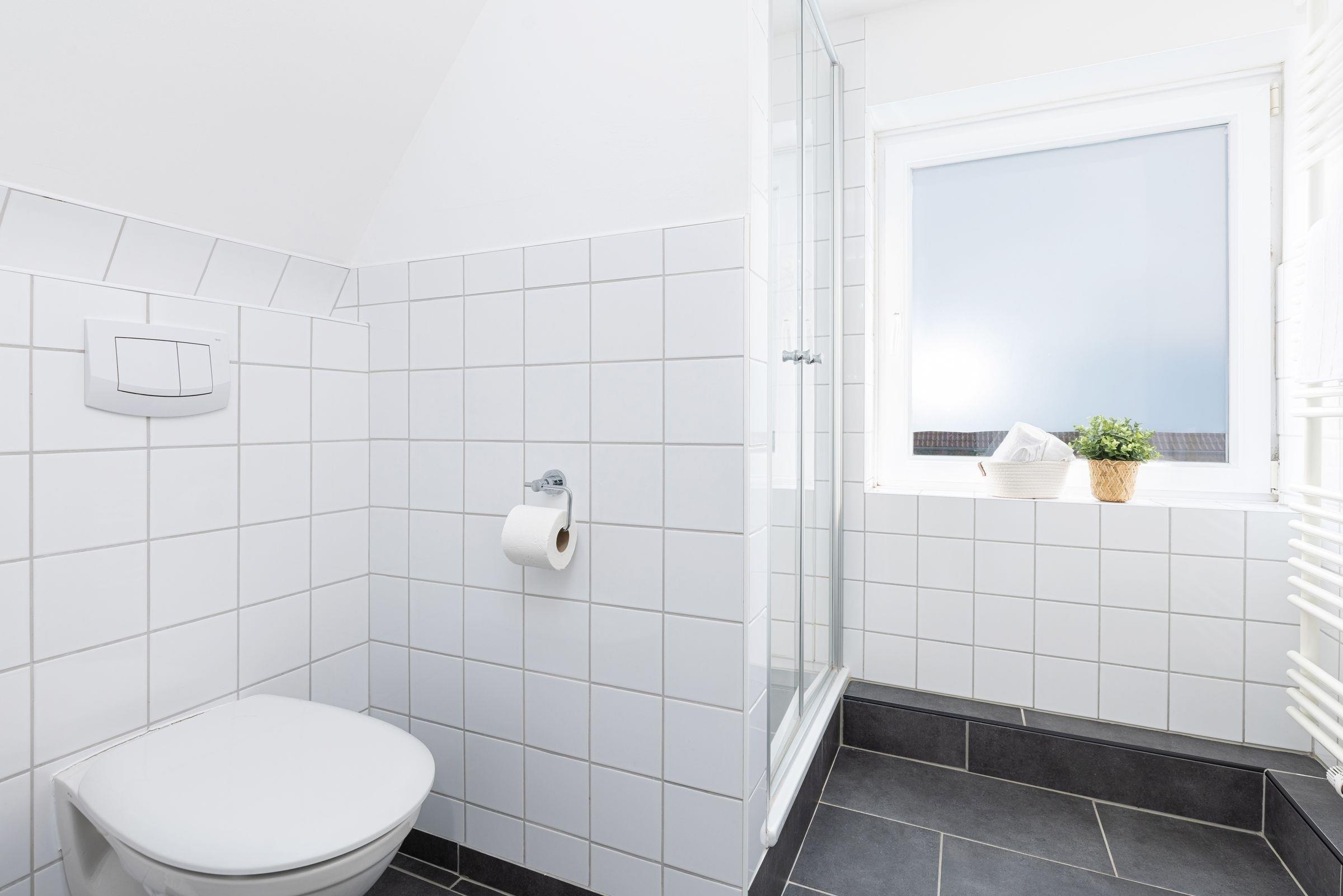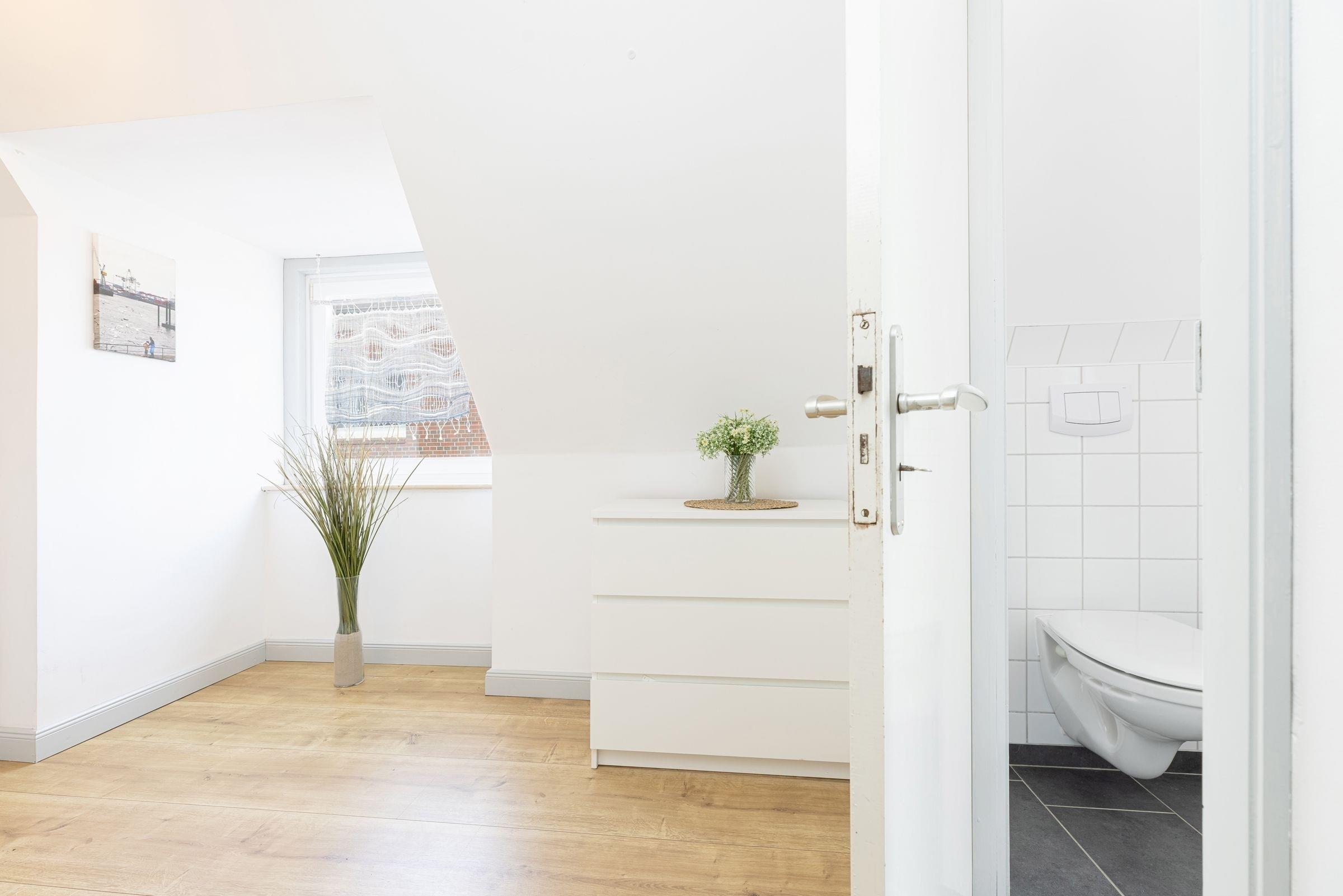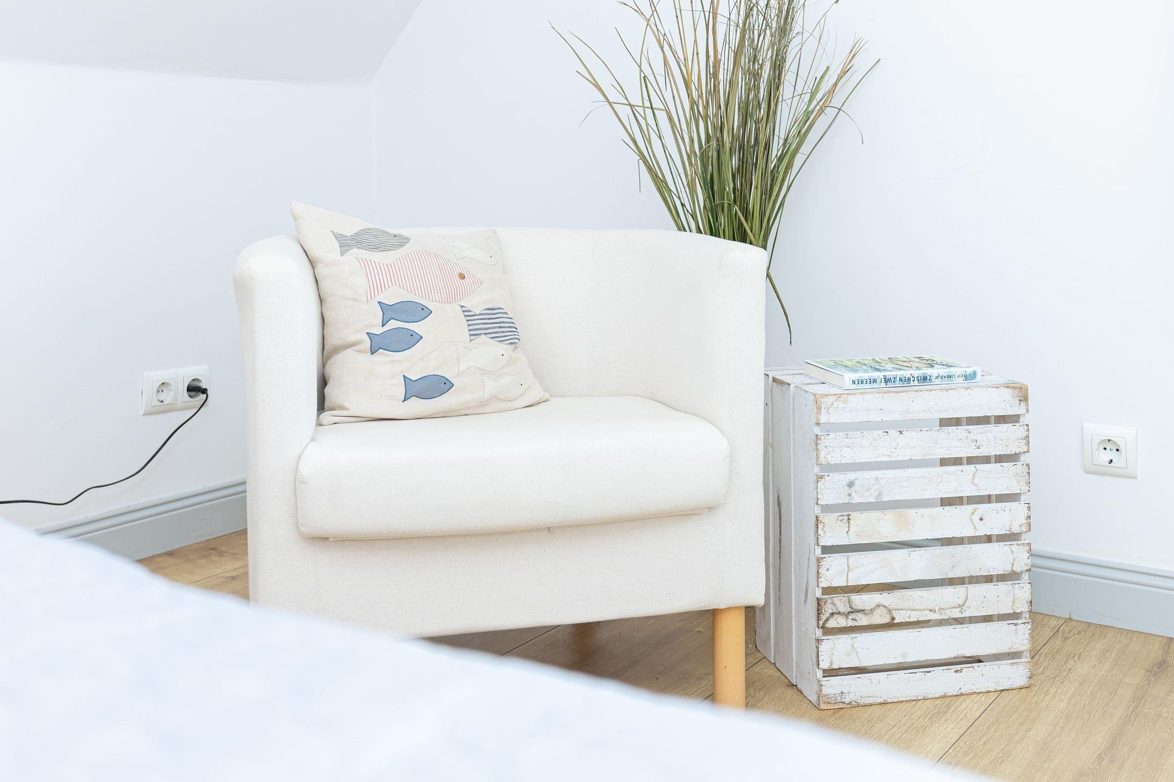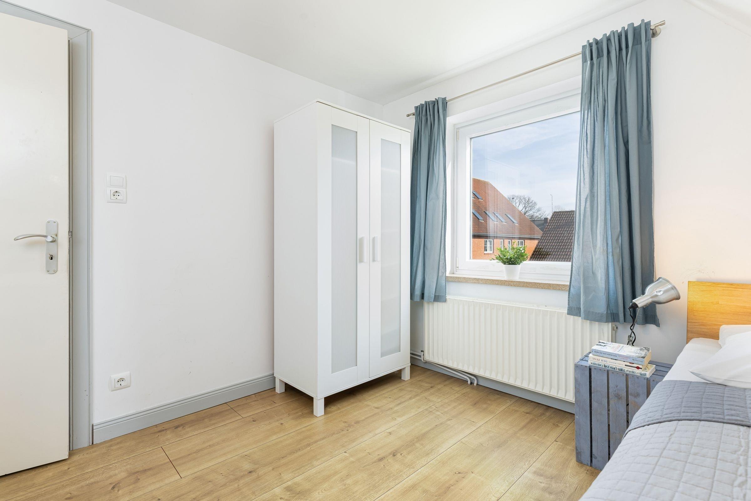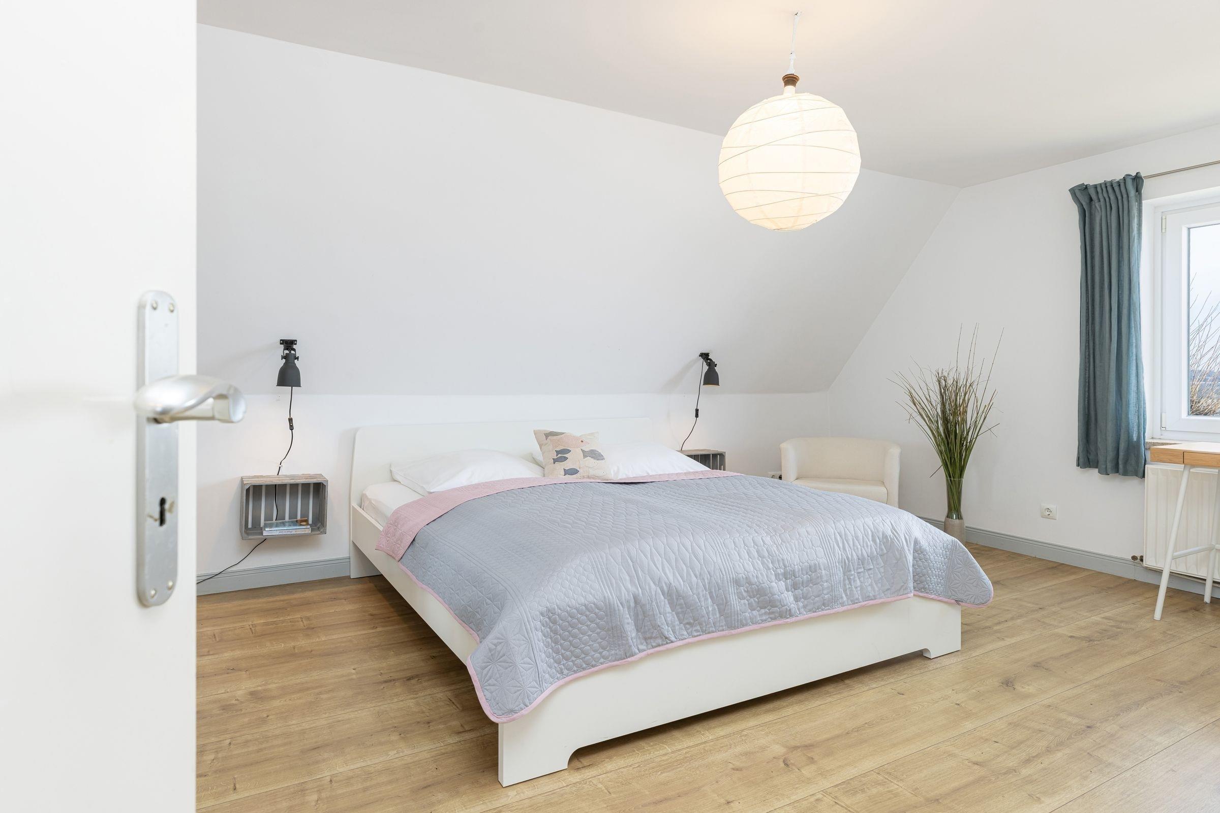 Im Erdgeschoss befinden sich 3 Zimmer, die miteinander verbunden sind. Die Küche ist mit einem Gas-Herd versehen und mit dem Essbereich verbunden. Es gibt im Anschluss ein Wohnzimmer mit Schlafcouch/ Sessel, einem TV mit DVBT-2 HD (Öffentlich-rechtliche + Private Programme in HD), großer Bücher- und DVD-Auswahl, Kaminofen und Zugang zur Terrasse, die eine herrliche Aussicht bietet. Zusätzlich ist ein Gäste-WC vorhanden. Das Bad im Dachgeschoss ist mit Dusche in der Schräge ausgestattet. Das Hauptschlafzimmer ist mit einem Doppelbett (180x200 cm), Kleiderschrank und Schreibtisch mit Fördeblick eingerichtet, das zweite Schlafzimmer verfügt über 2 Einzelbetten (je 90x200 cm).