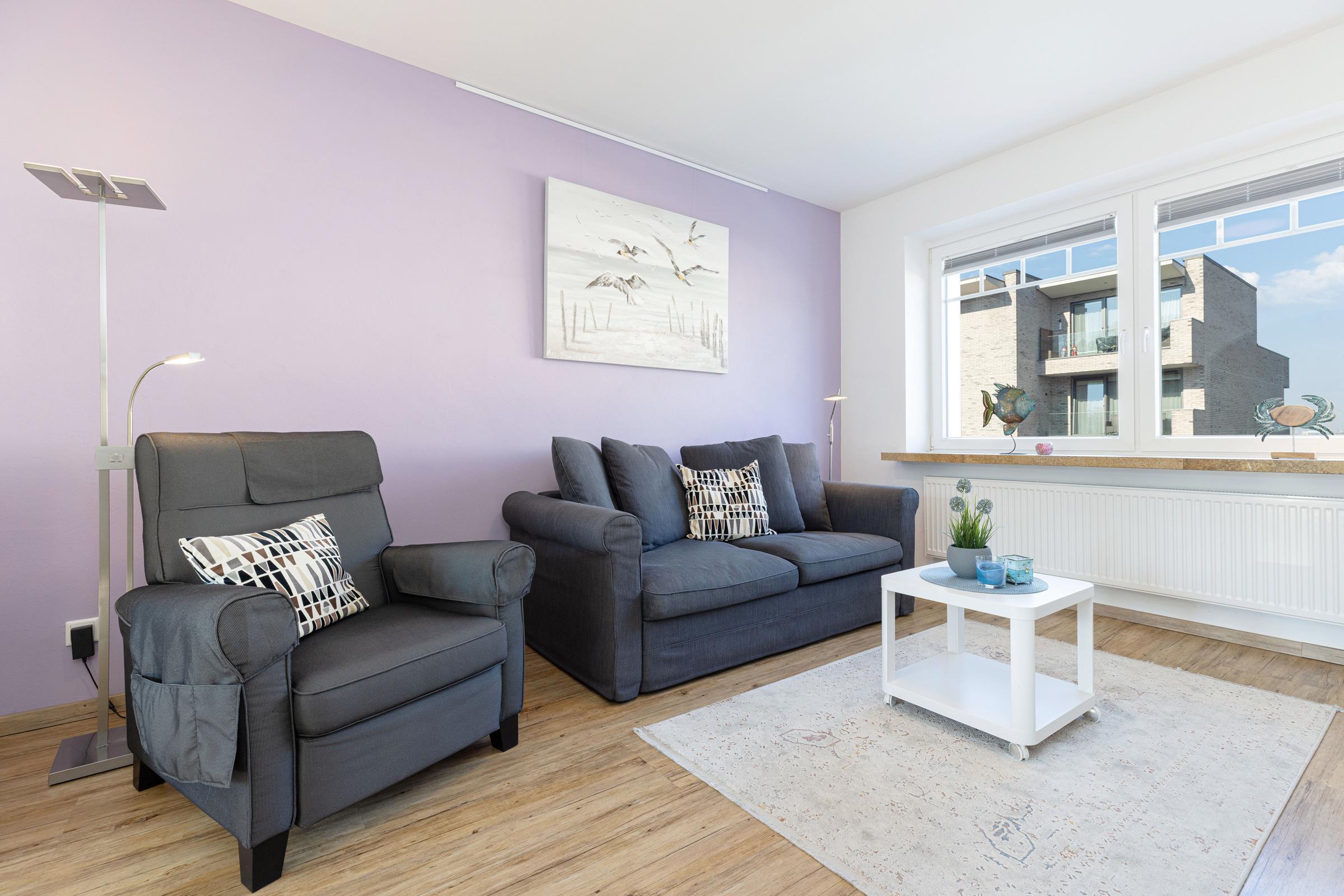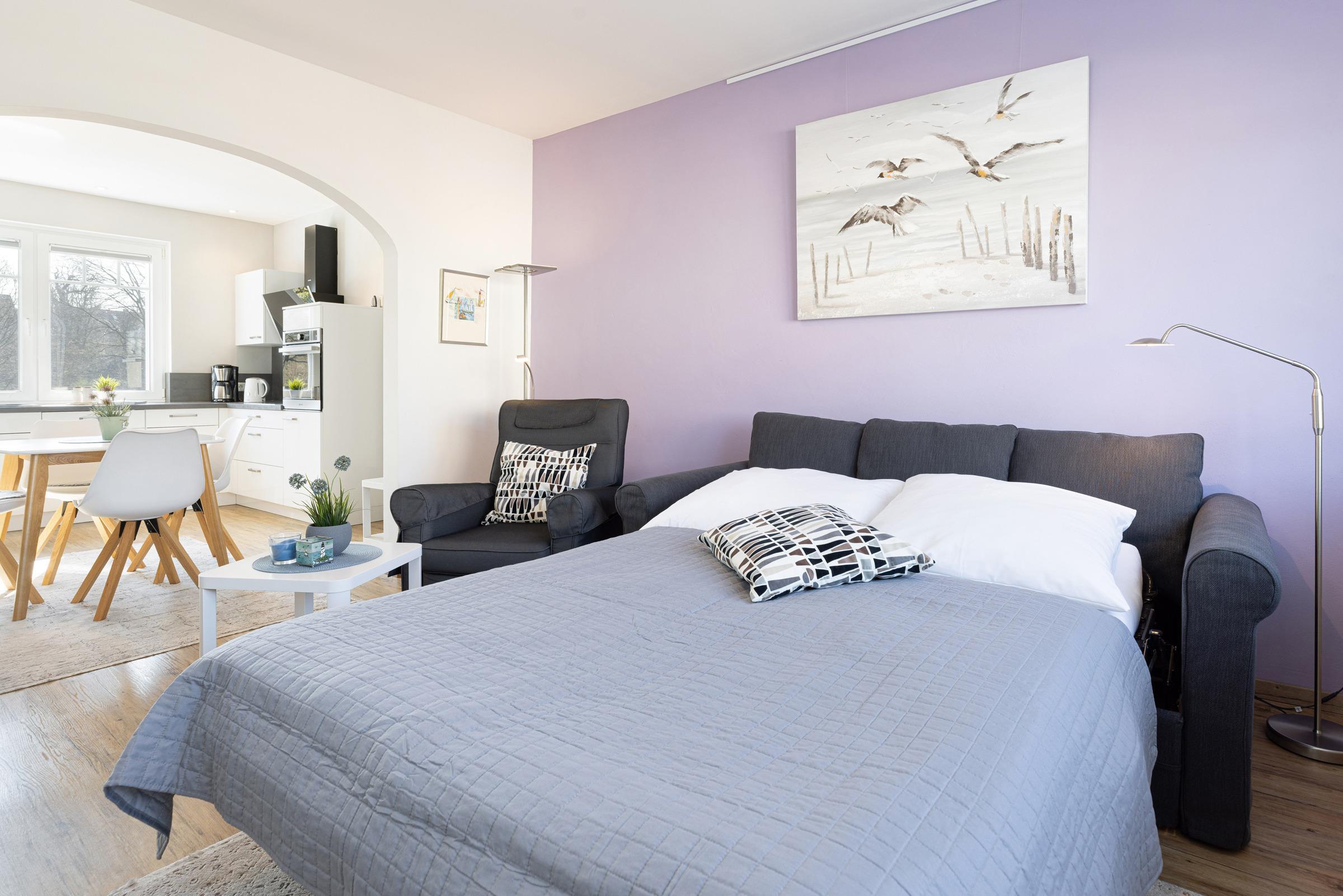 Die Eigentümer haben die Renovierung mit viel Liebe zum Detail geplant. Das Badezimmer verfügt über eine große bodengleiche Dusche und als Clou über eine Klönschnack-Tür, die zum Balkon mit Gartenblick führt. Der große Wohnküchen-Bereich umfasst die gesamte Tiefe des Hauses und bietet zur einen Seite ebenfalls einen Blick in den Garten und zur anderen Seite einen teilweisen Blick auf das Meer über die Strandstraße hinweg. Es erwartet die Gäste eine ganz neue Küche mit viel Zubehör, ein kleiner Esstisch, eine große Couch und ein Smart-TV mit vielen Programmen und Zugriffen auf diverse Mediatheken. Hochgeschwindigkeits-WLAN ist selbstverständlich ebenfalls für die Gäste verfügbar. Das kleine Schlafzimmer ist mit einem zusätzlichen TV-Gerät und einem neuen Bett samt neuer Matratzen und Kleiderschrank ausgestattet.