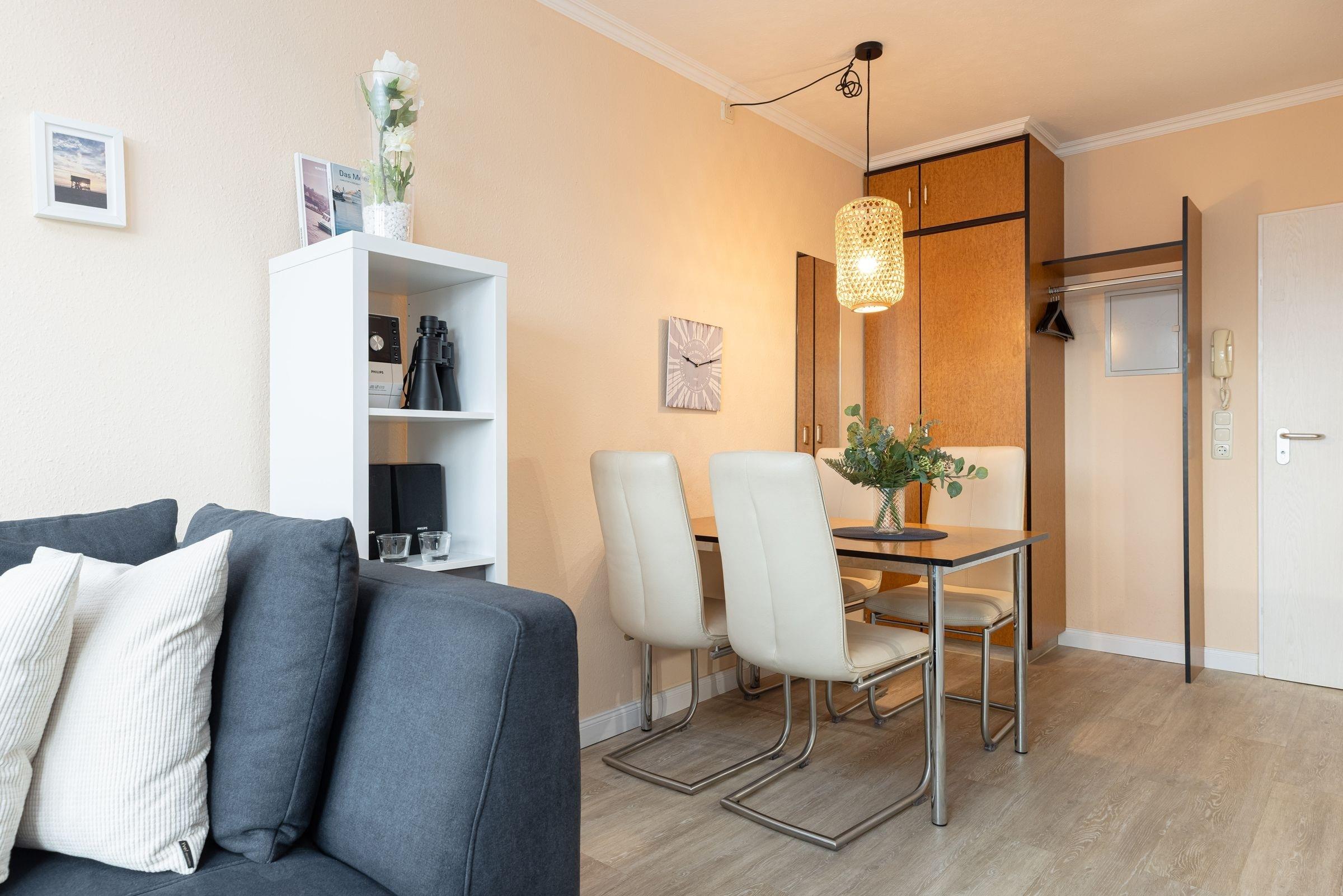 Das Appartement ist liebevoll und modern ausgestattet. Vom Wohnbereich haben Sie einen seitlichen Blick auf das Laboer Ehrenmal sowie den Sportboothafen. Das Appartement unterteilt sich in ein helles Wohnzimmer mit Schlafcouch (140x 200 cm ), einen angrenzenden Essbereich mit offener Küchenzeile, ein gemütliches Schlafzimmer mit Doppelbett (160x200 cm) sowie ein Duschbad.