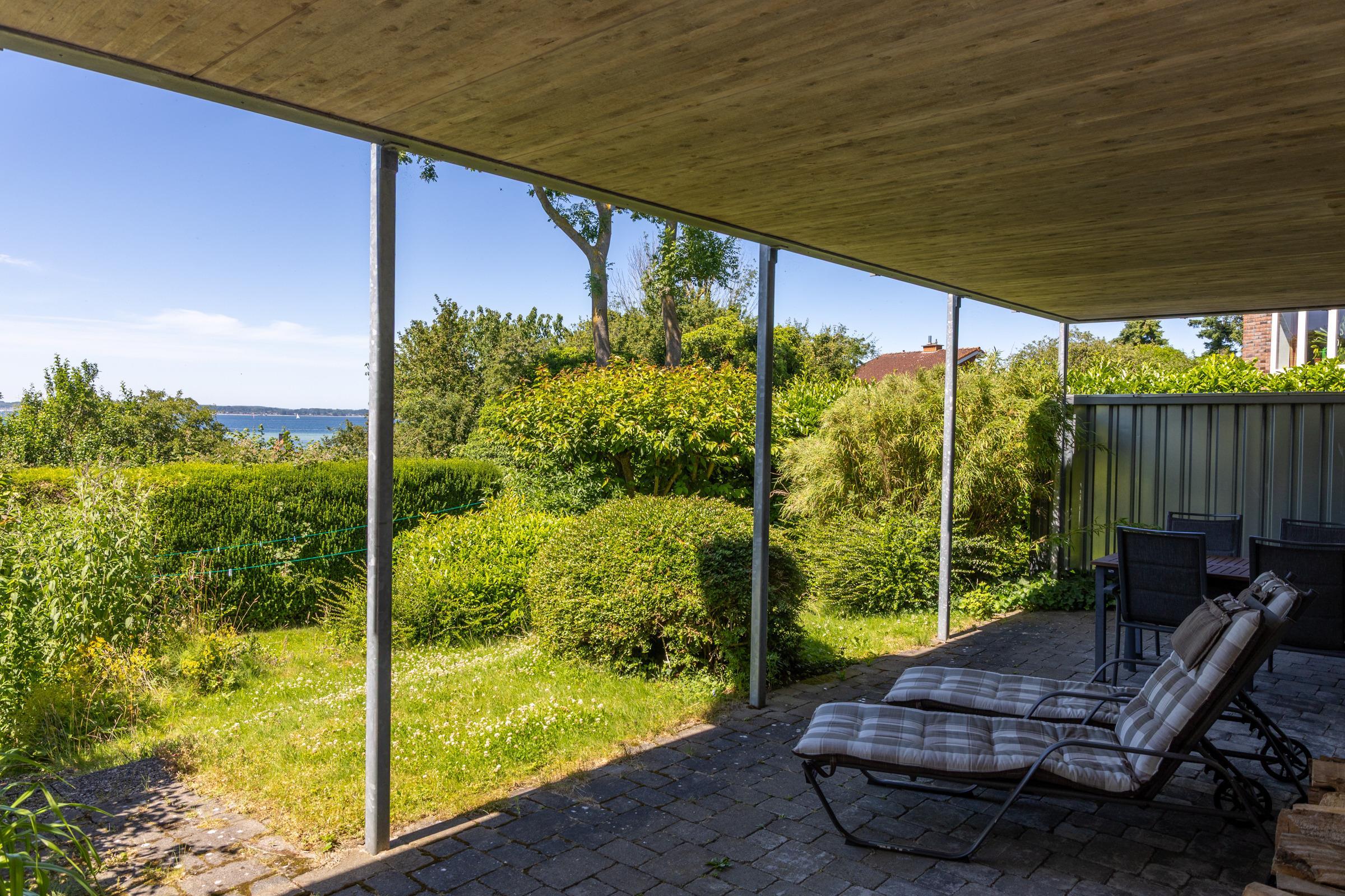 Ein geräumiger Flur empfängt Sie und führt in das großzügige und nordisch-modern eingerichtete Wohnzimmer. Die Sofaecke bietet bei Tag Entspannung nach ausgiebigen Strandspaziergängen und nachts Schlafplätze für zwei Personen. Die zum Wohnzimmer hin offene Küche und der Esstisch ermöglichen gemütliche Stunden des Beisammenseins. Der Blick schweift von der überdachten Terrasse über den kleinen, romantischen Garten bis hin zur Förde. Ein wunderbares Plätzchen, um den Abend vielleicht bei einem guten Tropfen ausklingen zu lassen. Das Schlafzimmer ist mit Schränken für Ihre Urlaubs-Garderobe und einem gemütlichen Doppelbett ausgestattet. Das komfortable Badezimmer verfügt über eine Dusche. Die Badewanne ist genau das richtige nach langen Winterspaziergängen entlang der Küste. Aufgrund der Hanglage verfügt das Bad nur über kleinere Fenster.