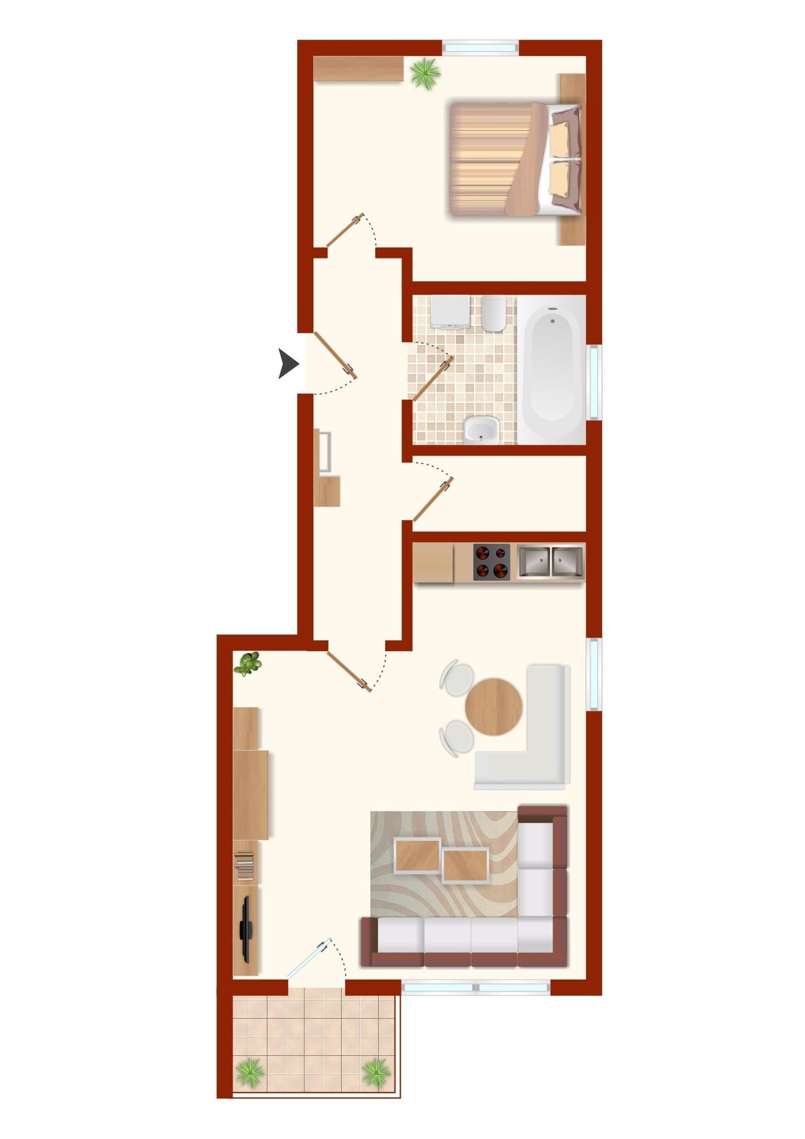 Diese helle und freundliche Wohnung im Erdgeschoss eines Mehrfamilienhauses ist ruhig gelegen. Die Wohnung ist aufgeteilt in Wohnzimmer mit integrierter Kochnische, Schlafzimmer und Bad. Das Schlafzimmer ist mit einem Doppelbett (180x200 cm) ausgestattet und der Kleiderschrank bietet ausreichend Raum für Ihre Garderobe. Das Badezimmer ist mit einer Badewanne mit Duschabtrennung ausgestattet.
