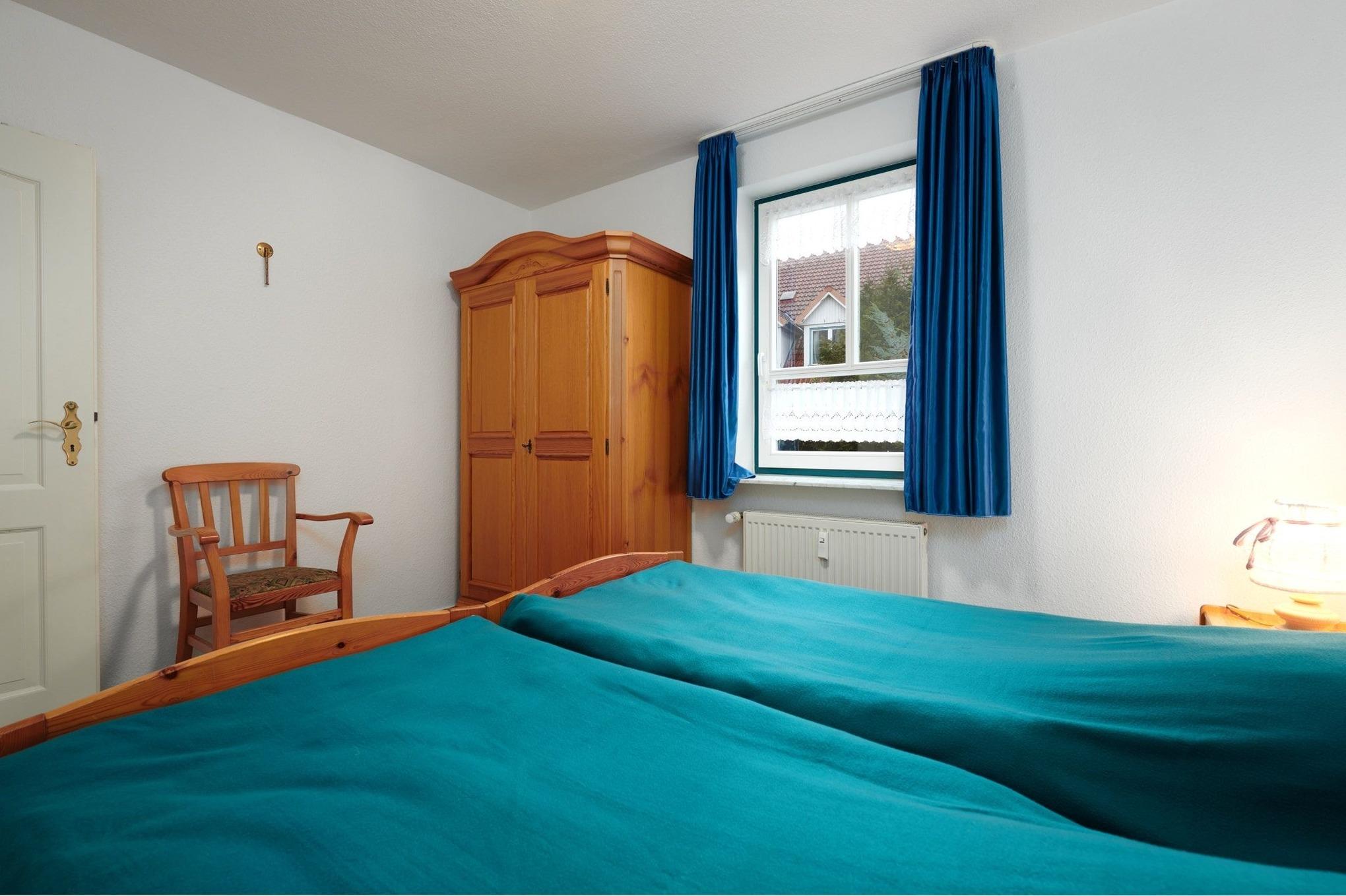 Schlafzimmer: 1 Doppelbett (2x 90x200 cm), Kleiderschrank, Verdunkelung: Gardinen