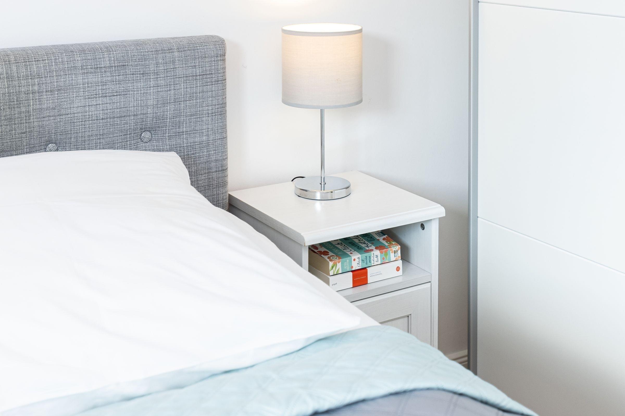 Schlafzimmer: Boxspringbett (ca. 180x200 cm), Kleiderschrank, Verdunkelung (Vorhang, Plissee)