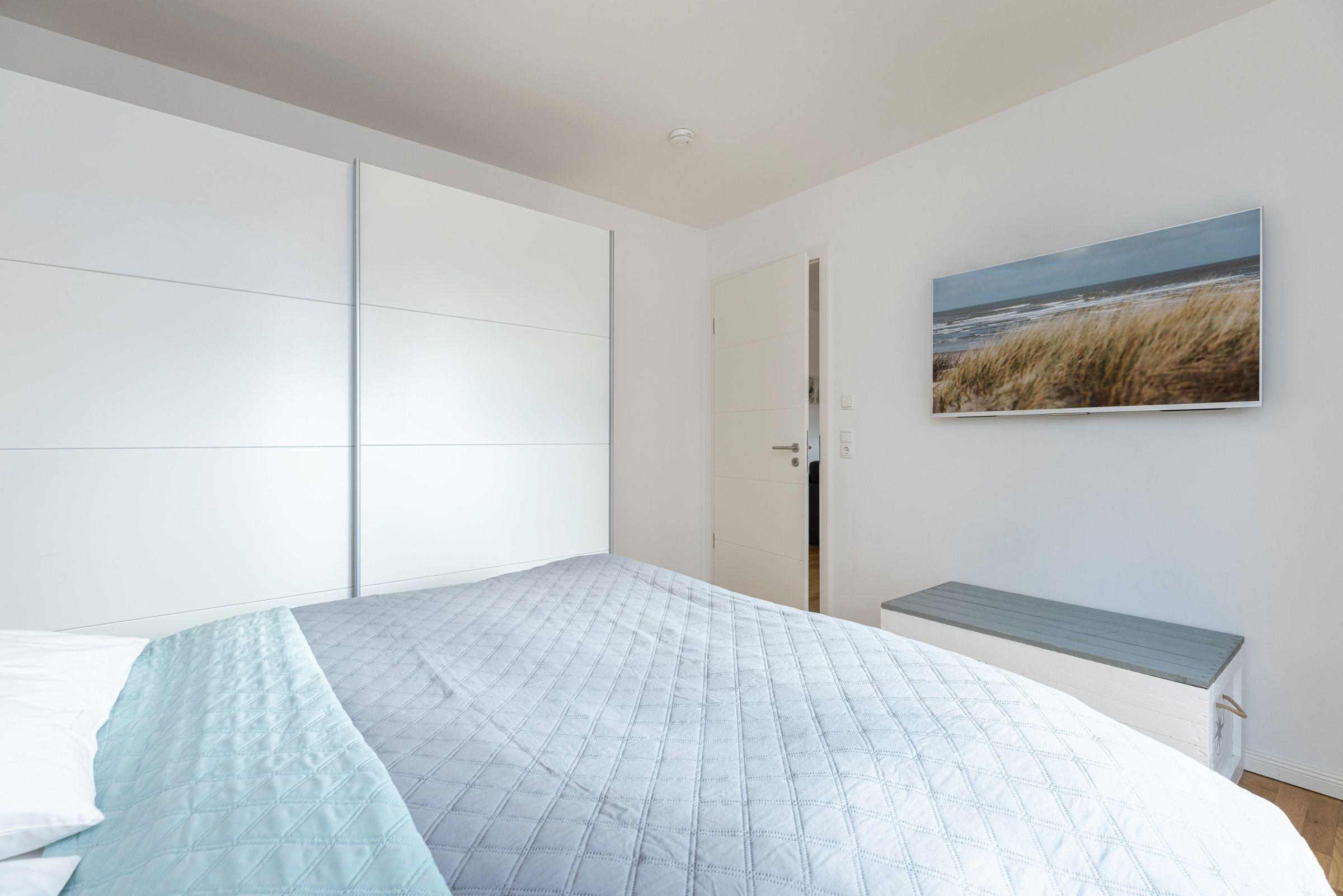 Die Wohnung empfängt Sie mit einem praktischen Flur. Das frisch-nordisch eingerichtete Wohnzimmer ist mit einer offenen Wohnküche ausgestattet. Auch die Möblierung des Wohnbereichs ist harmonisch aufeinander abgestimmt. Der Tisch lädt nicht nur zum gemeinsamen Essen ein, sondern ist wie gemacht für lange Abende in guter Gesellschaft. Das Sofa bietet nach ausgedehnten Strandspaziergängen ein angenehmes Plätzchen zum Relaxen. Für gemütliche Fernsehabende sorgt ein 50-Flatscreen mit Pay-TV. Neben dem Kabel-Fernseher sorgen die Stereoanlage, der DVD-Blu-Ray-Player und eine Playstation 4 für Abwechslung. Bei Nacht wird das 160x200 cm breite Sofa zur Schlafstatt für entweder zwei Kinder oder einen Erwachsenen. Die Küchenzeile ist modern gestaltet und dürfte keine kulinarischen Wünsche offen lassen. Ein Induktionsherd macht einfach nur Spaß, das Gefrierfach erleichtert den Einkauf und die Spülmaschine das Leben. Ein hochwertiger Backofen in bedienerfreundlicher Höhe ist ebenfalls vorhanden. Mit der Nespresso-Maschine können Sie sich z.B. einen leckeren Espresso nach dem Essen zubereiten. Vom Wohnzimmer gelangen Sie auf die schön ausgestattete Terrasse. Nordisches Ambiente auch hier, dank des Holzbodens. Im Sommer spendet dieser, nackten Füßen wohlige Wärme beim ersten Kaffee am Morgen. Und abends lässt sich nach ereignisreichen Ferientagen ein guter Tropfen wunderbar genießen. Das Schlafzimmer ist mit einem Doppelbett und einem weiteren Schrank für Ihre Garderobe versehen. Auch hier wurde an einen weiteren 43-Flat-TV gedacht. Das Duschbad ist hell, freundlich und modern ausgestattet.