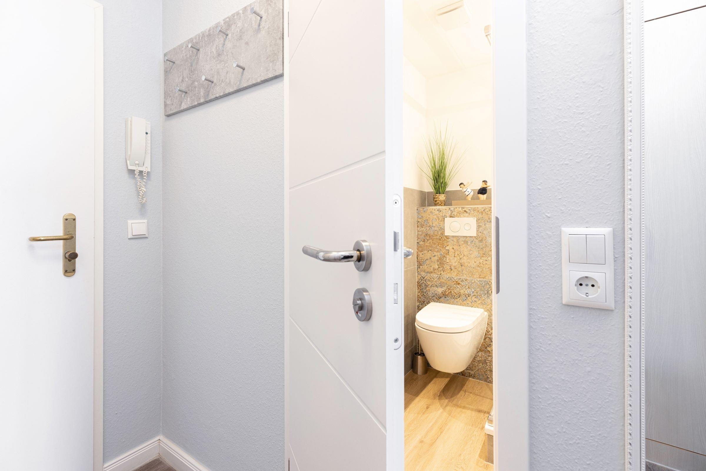 Der Durchgang vom Flur zum Hauptraum ist offen gestaltet, im Flur steht Ihnen ein geräumiger Einbauschrank zur Verfügung. Das sehr bequeme Doppelbett verfügt über Matratzen mit verschiedenen Härtegraden. Die Fenster können mit Plisses abgedunkelt werden. Die Küchenzeile ist komplett mit einem 4-Platten-Herd, einem Geschirrspüler und einer Mikrowelle ausgestattet. Bodentiefe Fenster sorgen für reichlich Licht und Luft im Zimmer. Das Badezimmer mit Dusche/ WC hat eine mit Glas verkleidete Duschkabine und einen Handtuchheizkörper. Die Duschkabine hat einen breiten Einstieg und verfügt als Besonderheit über beleuchteten Fugen. Eine moderne Regendusche sorgt für ein besonders Duscherlebnis. Über eine leistungsfähige WLAN-Verbindung können Sie bei Bedarf arbeiten oder im Internet surfen. Der große Fernseher hat eine Internetverbindung. Über den kostenlosen NETFLIX-Zugang können Sie aus tausenden von Filmen und Serien wählen. Wenn Sie die Tagesschau oder den Tatort einmal verpasst haben sollten, ist das kein Problem. Auch die Mediatheken sind über den Fernsehseher bequem zu laden. Lassen Sie sich von Ihrer elektronischen Mitarbeiterin Alexa den Wetterbericht von Laboe ansagen, neues aus der Politik berichten oder Ihren Lieblings-Radiosender spielen.