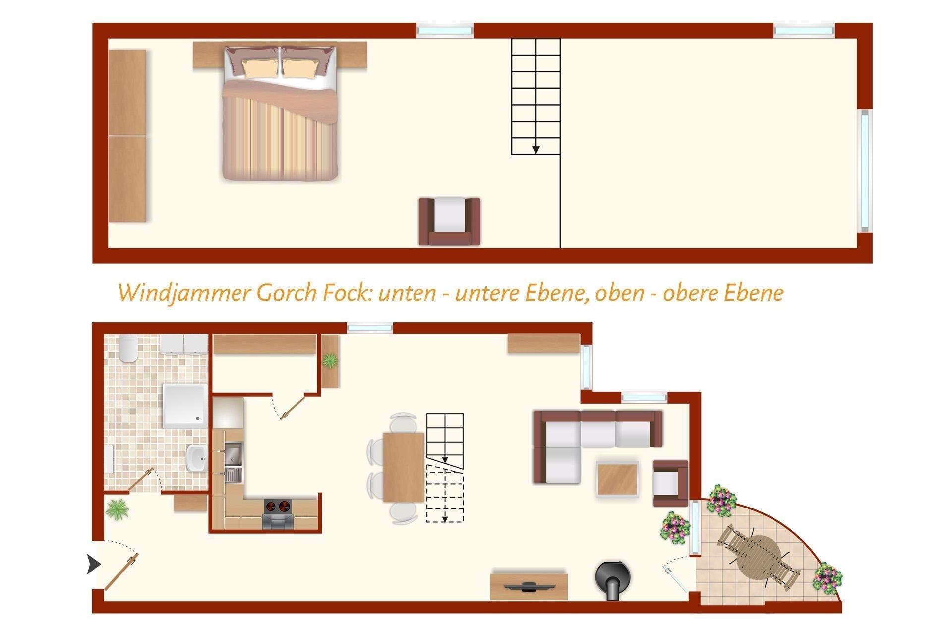 Die 2-Zimmer-Ferienwohnung Gorch Fock im Haus Windjammer in der 2. Etage bietet Platz für max. 4 Personen.