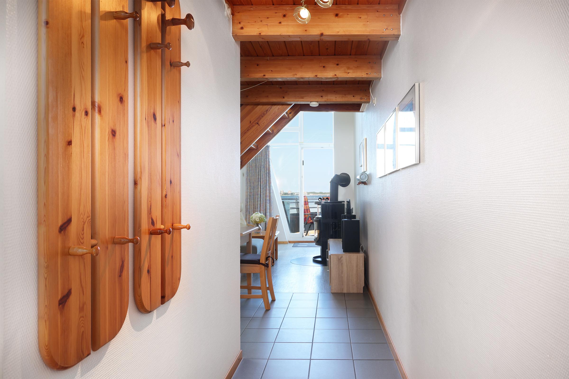 Die schöne 51 m² große Galeriewohnung besteht aus einem großzügigen Wohnbereich mit Schlafcouch, Essecke und Pantry-Küche, Badezimmer. Auf der offenen Galerie befindet sich das Schlafzimmer. Auch von dort haben Sie einen Blick auf die Kieler Förde. Vom Balkon genießen Sie ebenfalls einen unvergleichbaren Förde-Panoramablick. In den kühleren Monaten sorgt ein dänischer Kaminofen für eine zusätzliche Gemütlichkeit.