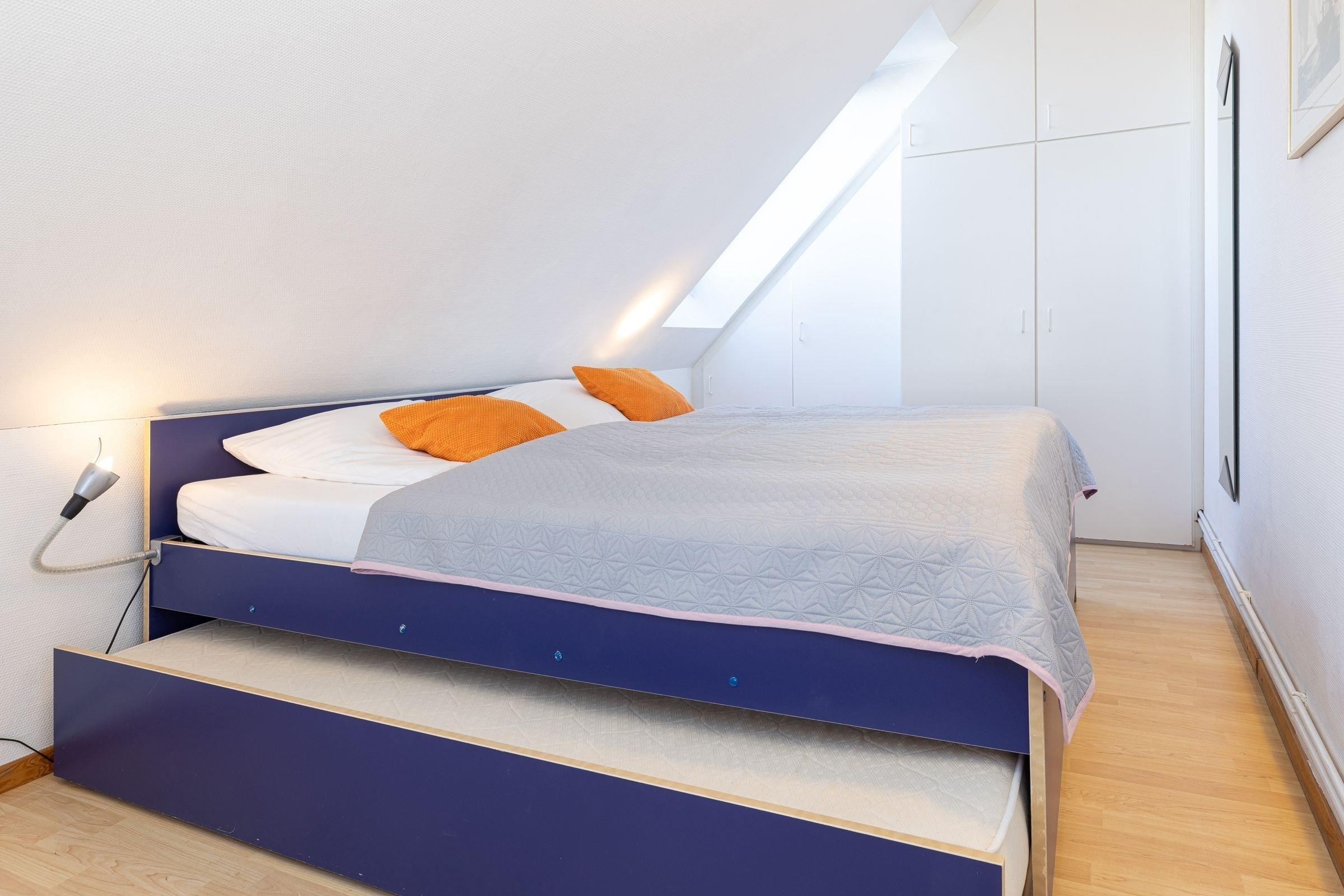 Die maritime 51 m² große Galeriewohnung besteht aus einer Pantry-Küche, Badezimmer, Wohnbereich mit Schlafcouch und einem offenen Schlafbereich auf der Galerie. Das Doppelbett im Schlafzimmer lässt sich zusätzlich ausziehen, sodass ein täglicher Umbau auch mit 4 Personen nicht unbedingt nötig ist. Genießen Sie aus dieser außergewöhnlichen Wohnung einen atemberaubenden Panoramablick auf die Kieler Förde. In der kälteren Jahreszeit sorgt ein Kaminofen für wohlige Wärme und Gemütlichkeit.