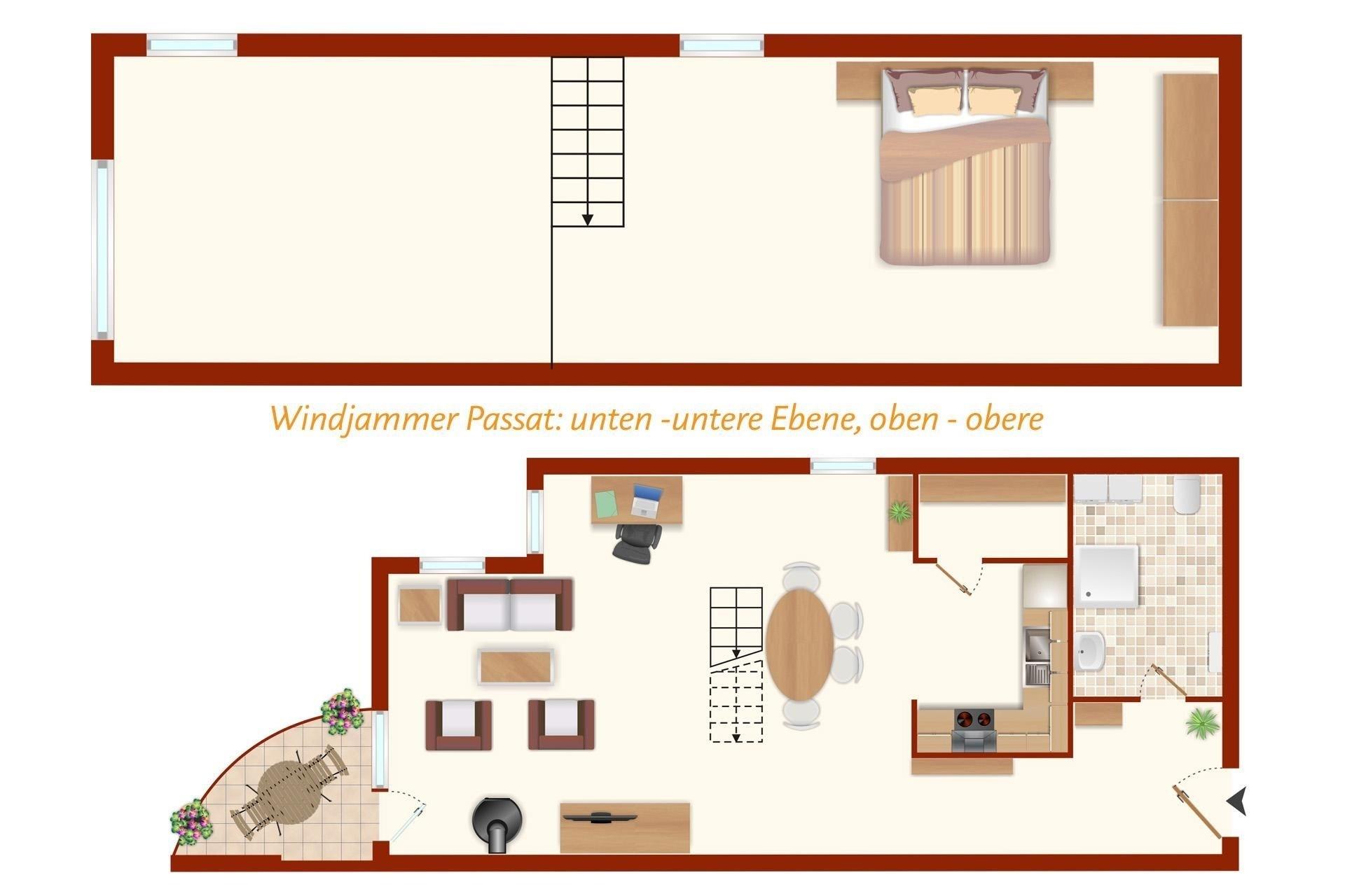 Die 2-Zimmer-Ferienwohnung Passat im Haus Windjammer befindet sich in der 2. Etage und bietet Platz für max. 4 Personen.