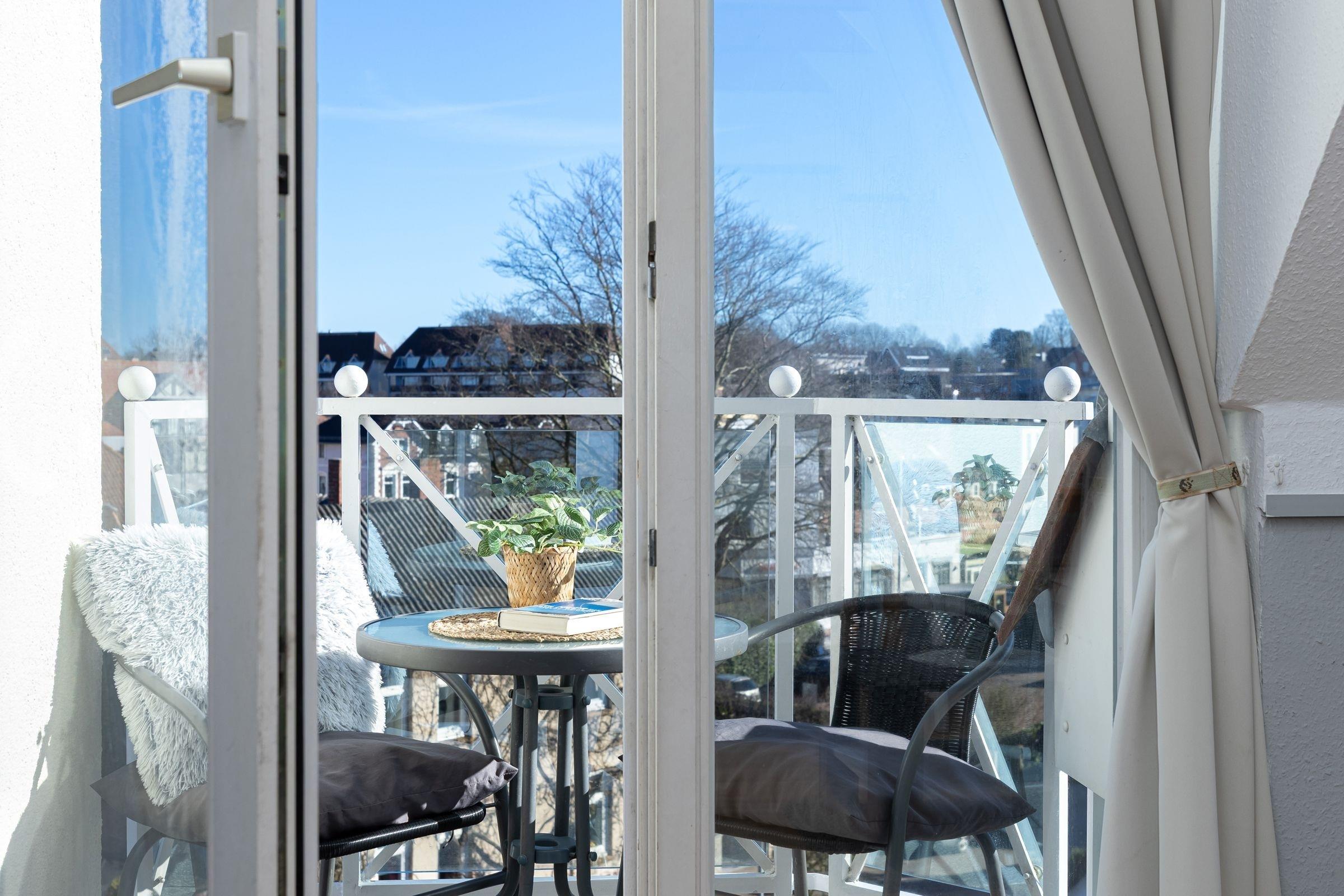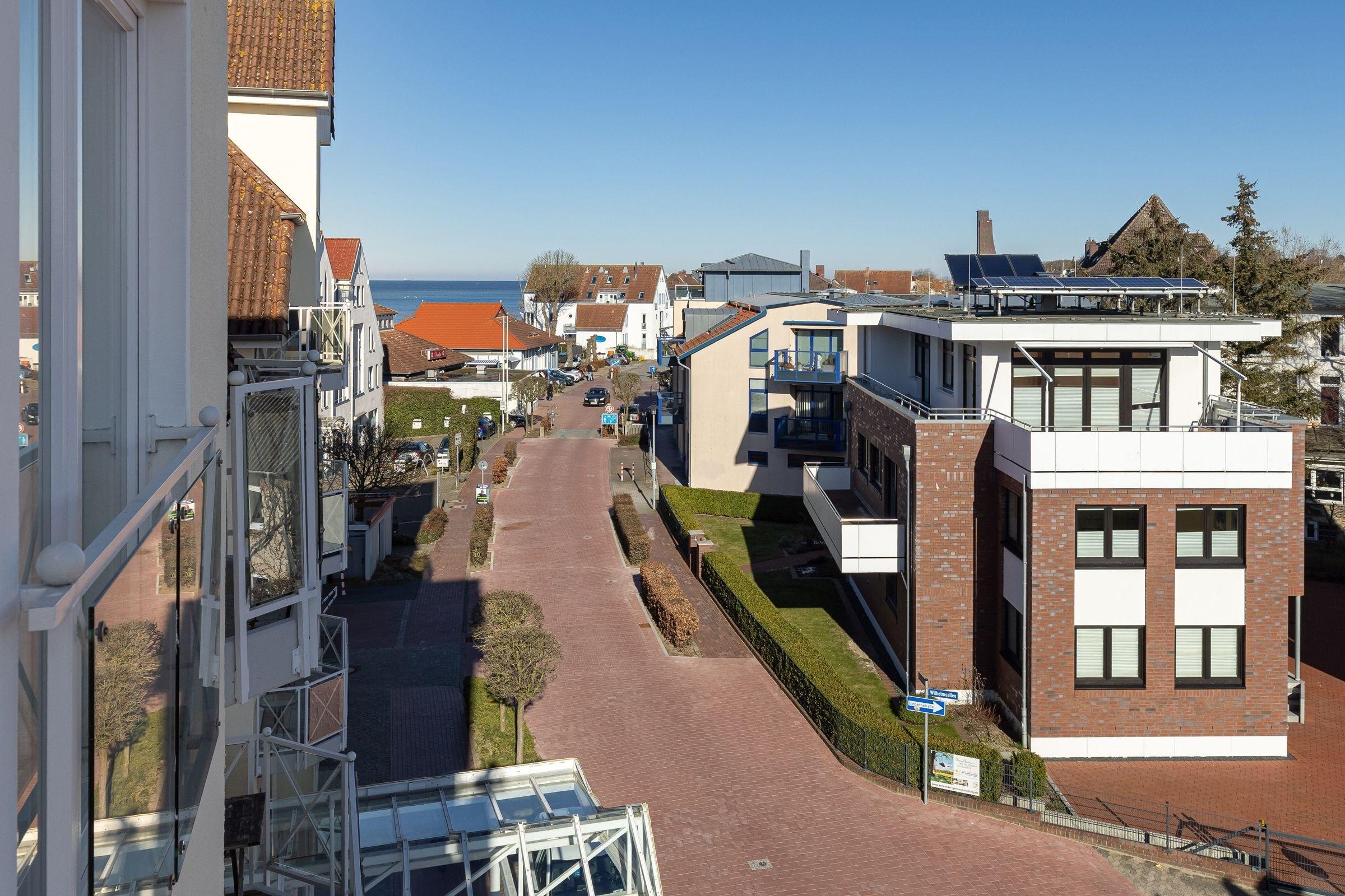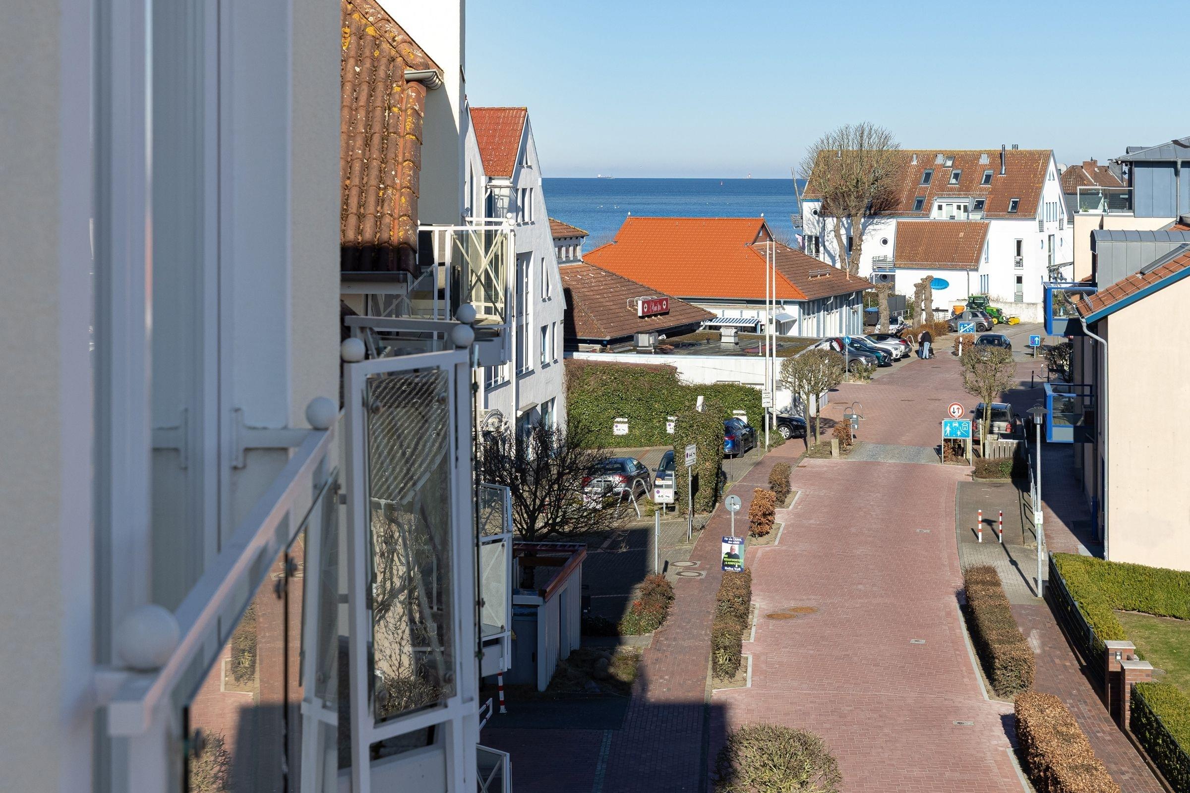 Gemütliche Ferienwohnung mit Balkon direkt an der Strandpromenade in Laboe, ideal für erholsamen Strandurlaub.