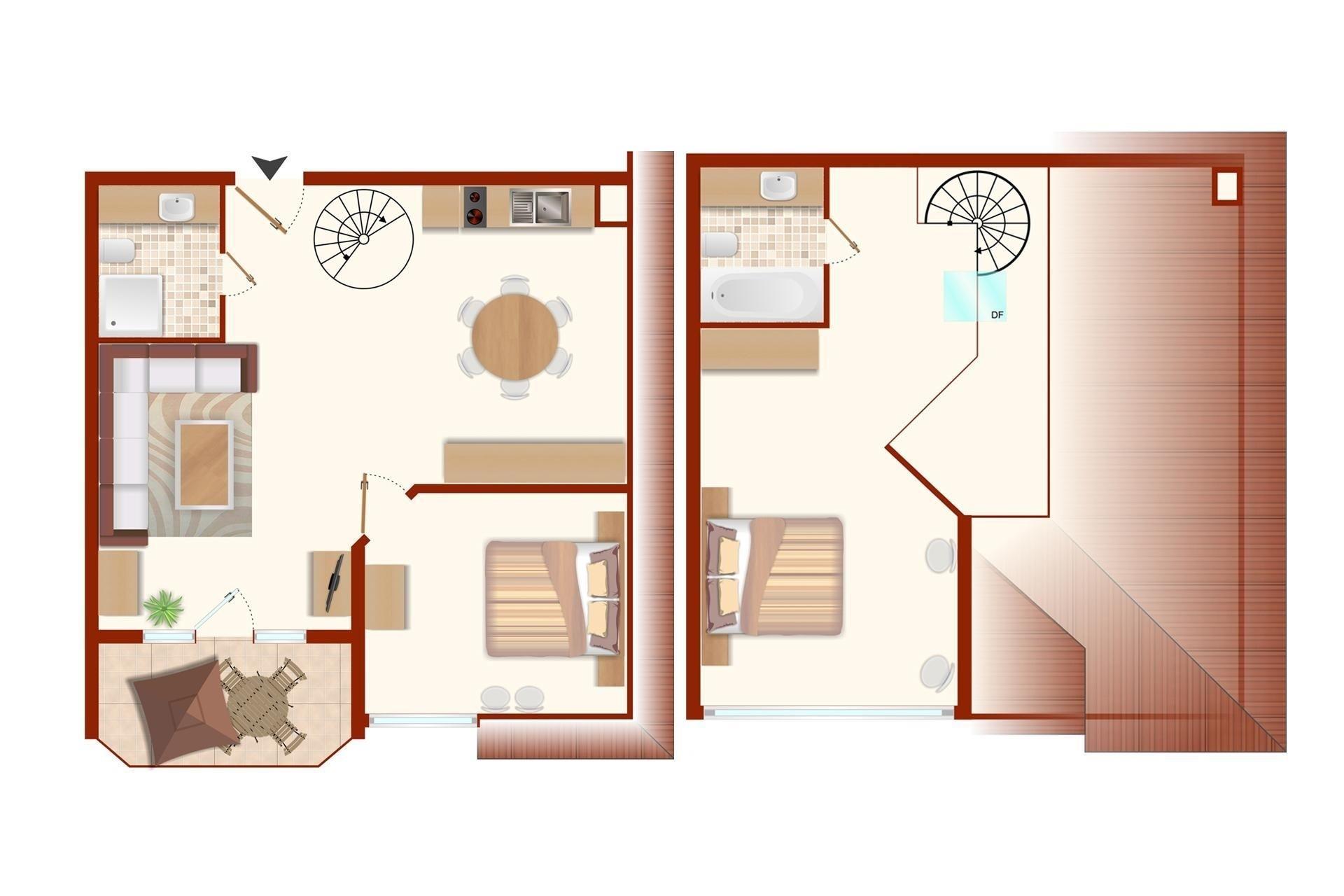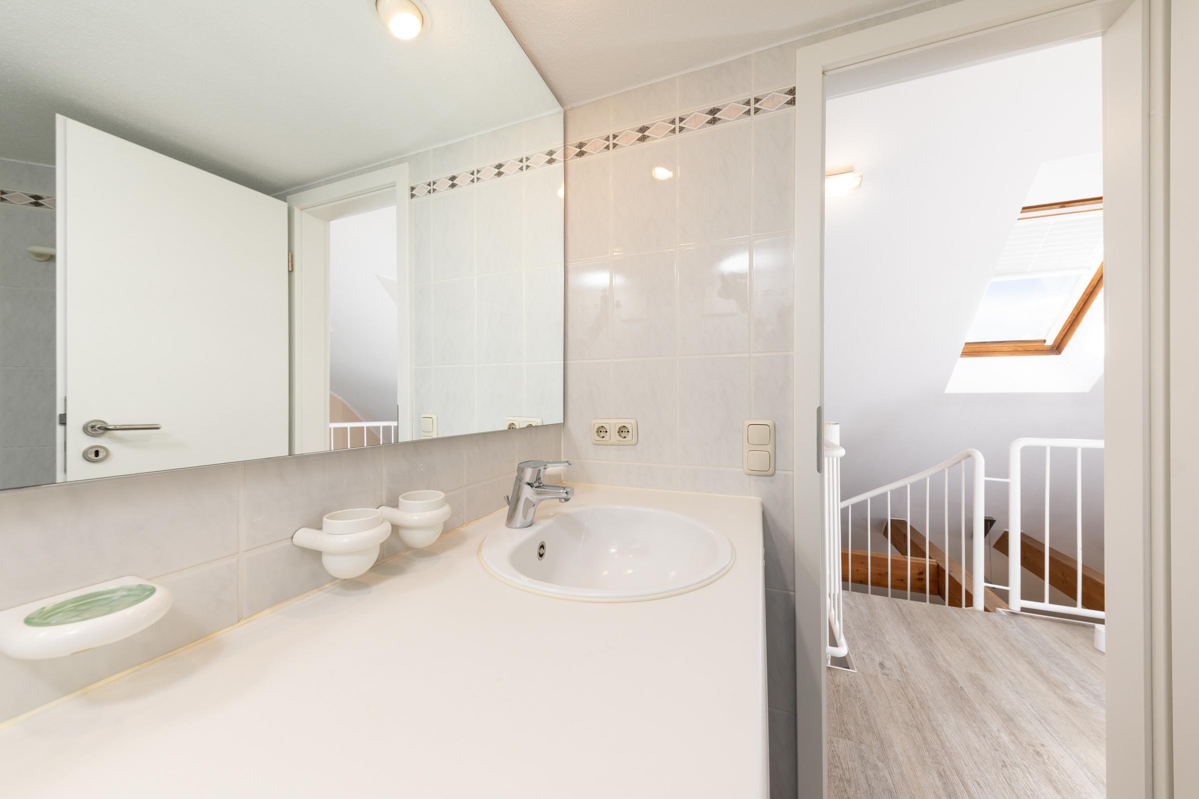 Ein frisch und nordisch ausgestatteter Wohnraum empfängt Sie mit seinem warmen Ambiente. Hier ist es gelungen die moderne Küchenzeile geschmackvoll zu integrieren. Der Wohnbereich mit Schlafsofa für zwei Personen ist mit weiteren einladenden Sitzgelegenheiten ausgestattet und befindet sich direkt vor der Fensterfront mit weitem Blick auf das Meer, den Strand und das bunte Treiben der Strandpromenade. Die moderne Küche verfügt über eine Geschirrspülmaschine, Backofen, Mikrowelle und einem Ceran-Kochfeld, damit es Ihnen auch im Urlaub an nichts fehlt. Ein großer Esstisch lädt zum gemeinsamen Essen, Spieleabenden und langen Nächten in guter Gesellschaft ein. Eines der beiden Schlafzimmer mit Doppelbett, einem weiteren Flat-TV sowie einem Kleiderschrank befindet sich auf gleicher Ebene. Das Fenster ist dem Meer zugewandt. Auf gleicher Ebene befindet sich das Duschbad. Eine Wendeltreppe führt aus dem Eingangsbereich hinauf in die zweite Ebene mit noch mehr Aussicht. Hier erwartet Sie auf einer zum Wohnraum hin offenen Galerie, das zweite, sehr großzügige Schlafzimmer. Auch hier mit Doppelbett und Panoramablick. Ein weiterer Kleiderschrank beherbergt hier Ihre Urlaubsgarderobe. Ein zweites Badezimmer macht den Urlaub besonders komfortabel. Die Badewanne lädt nach langen Strandspaziergängen, besonders in Ostsee-Winterluft ein.