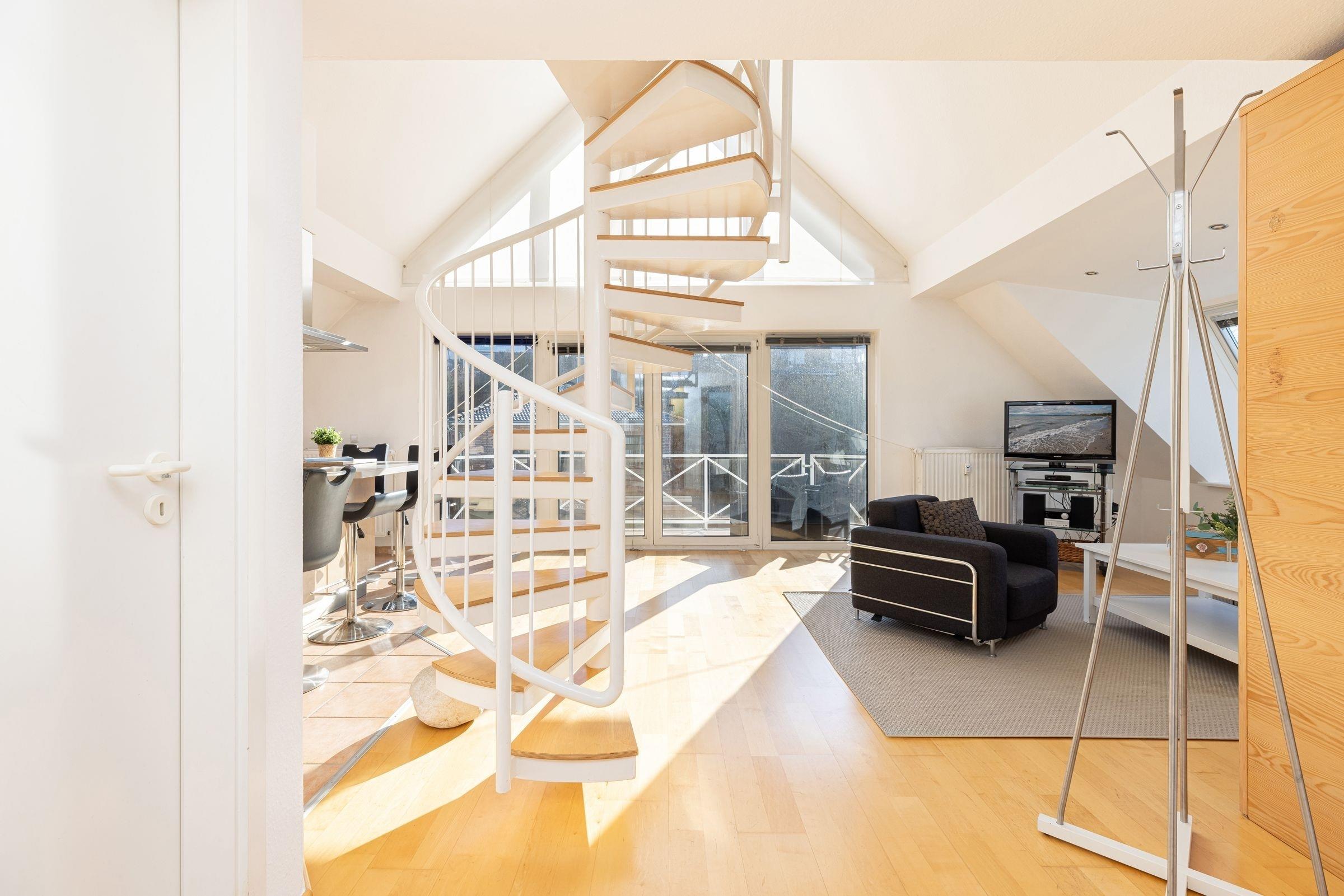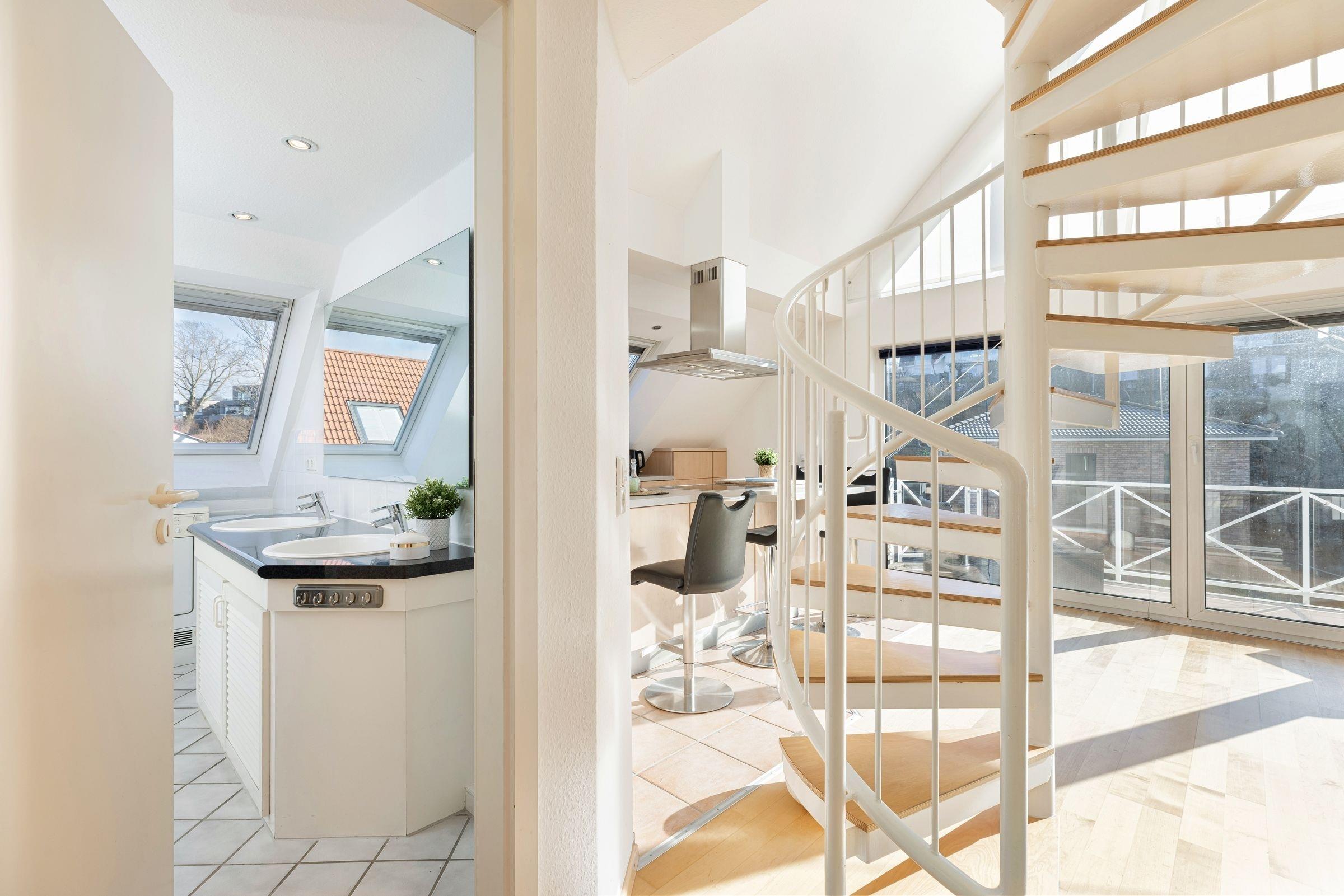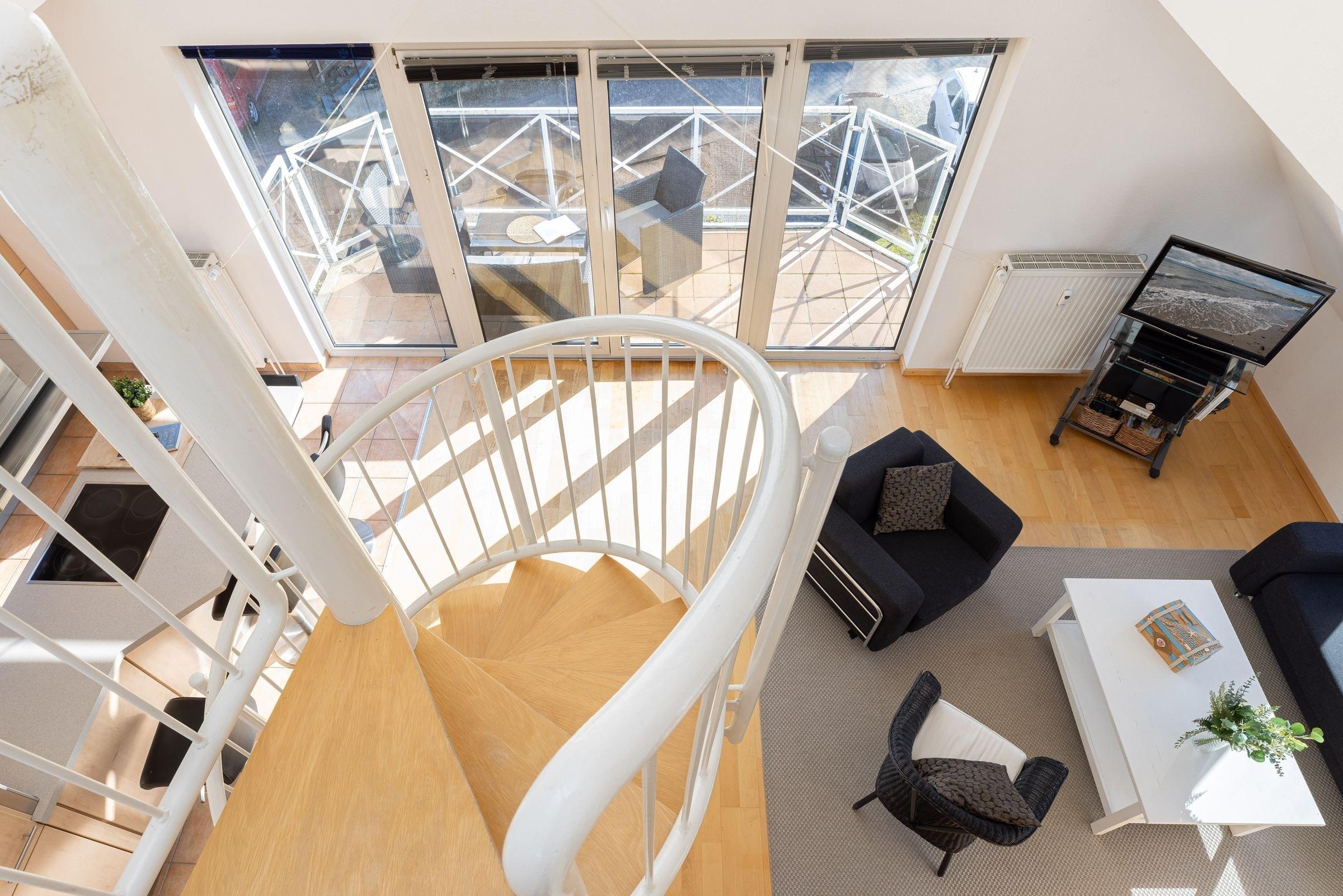 In diesem traumhaften Galerie-Appartement können Sie einen wunderschönen Urlaub erleben. Der kombinierte Wohn-Essbereich mit der offenen Küchenzeile und einem Schlafzimmer mit zwei Einzelbetten befindet sich auf der unteren Ebene. Ebenso das große, tageslichthelle Badezimmer mit zwei Waschtischen und Badewanne sowie Waschmaschine und Trockner. Auf dem Balkon mit gemütlichen Lounge-Möbeln können Sie den Tag noch einmal Revue passieren lassen. Der zweite, offene Schlafbereich befindet sich auf der oberen Ebene und ist mit einem Doppelbett ausgestattet. Sie gelangen über eine Wendeltreppe vom Wohnzimmer aus auf die Galerie. Der Ortskern, der malerische Hafen und der feinsandige Ostseestrand sind in wenigen Minuten zu Fuß zu erreichen.