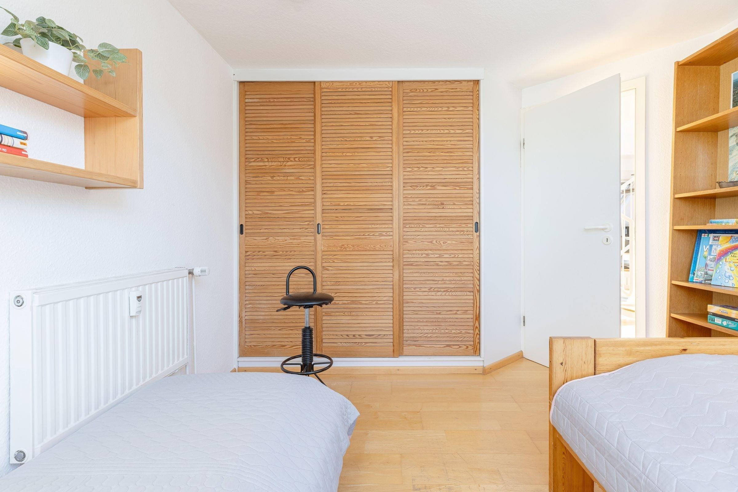 Schlafzimmer 1: 2 Einzelbetten, Kleiderschrank, Verdunkelung (Rollo)