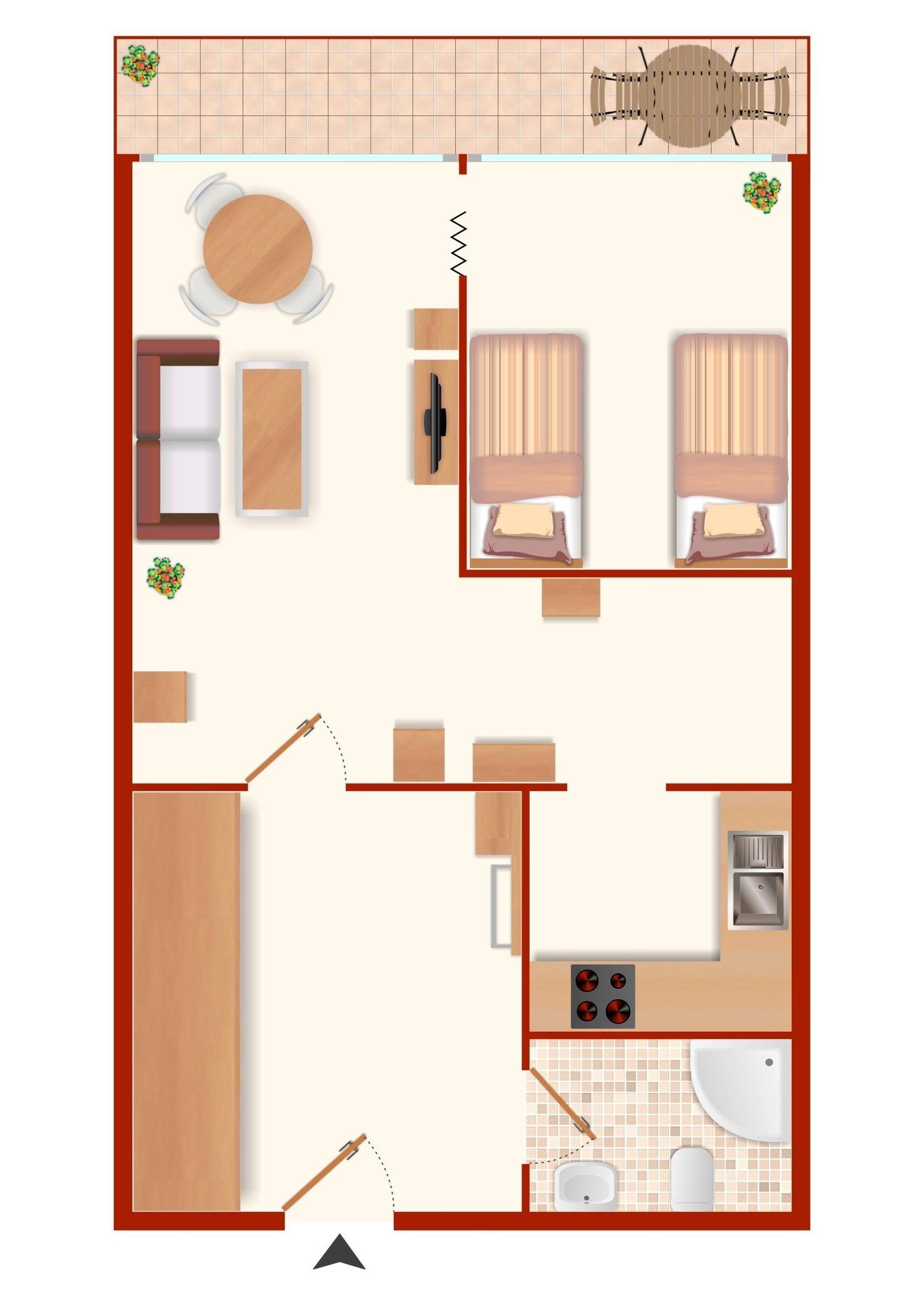 In der maritim eingerichteten Wohnung gibt es eine Küche, ein Bad mit Dusche und WC, einen kombinierten Wohn-/Schlafraum mit Essecke und Schlafsofa (160x200 cm) plus TV sowie einen separaten Schlafraum mit 2 hochwertigen Einzelbetten und TV. Im modernisierten Badezimmer steht Ihnen neben einer fast ebenerdigen Dusche mit Duschhocker eine Waschmaschine zur Verfügung. Vom Balkon aus können Sie bei einer Tasse Kaffee sogar einen kleinen Blick auf die Ostsee erhaschen.