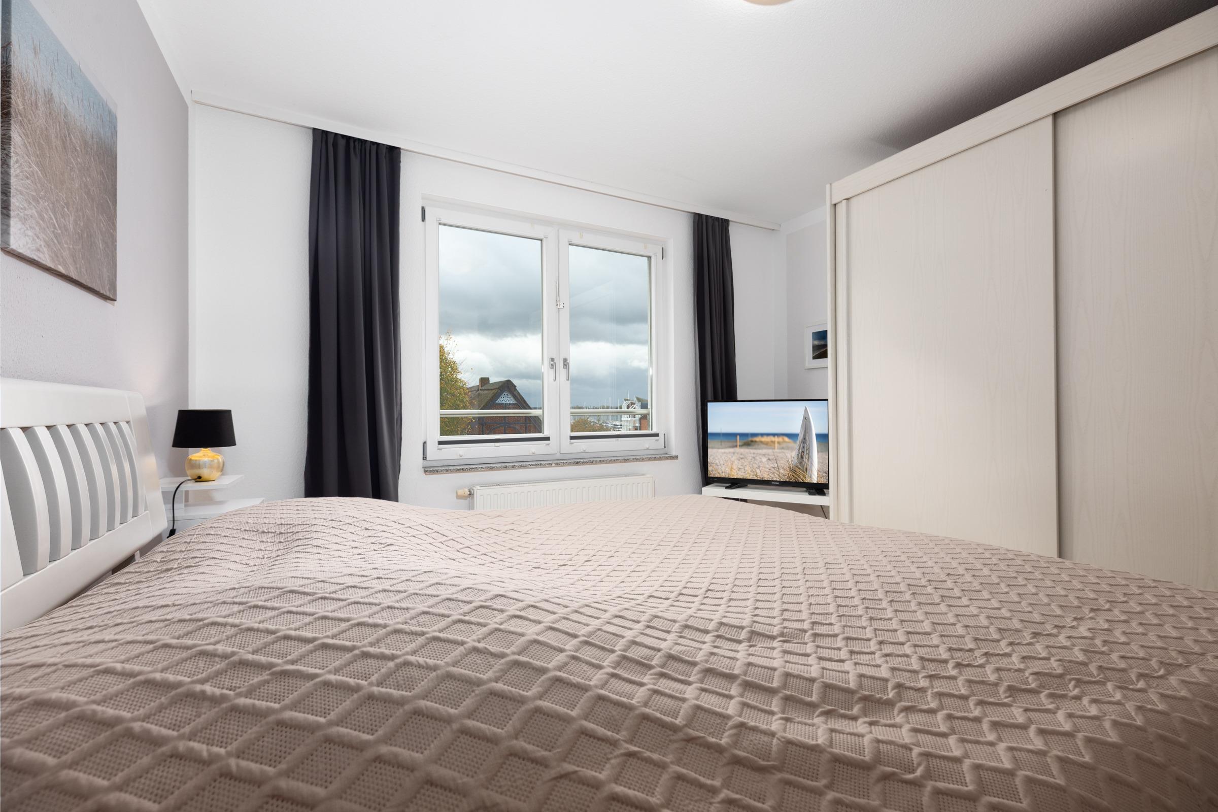 Schlafzimmer 1: Doppelbett (2x 90x200 cm), Kleiderschrank, Verdunkelung (Vorhänge, Plissee)