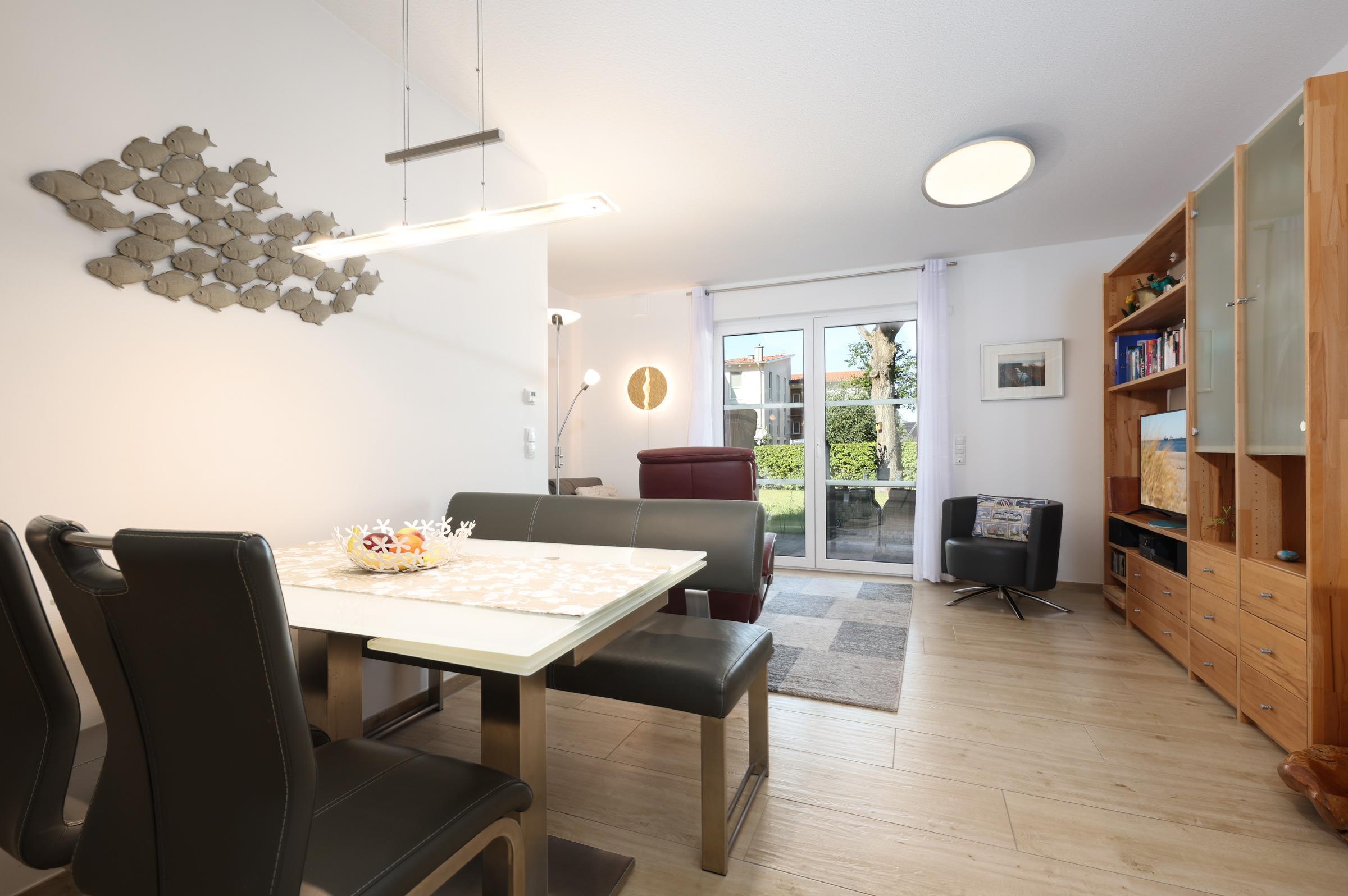 Im Eingangsbereich befindet sich die Garderobe und ein Abstellbereich, in dem Sie sowohl Reinigungsutensilien als auch ein separaten Gefrierschrank finden. Das davon abgehende Badezimmer ist großzügig gestaltet mit einer ebenerdigen Dusche und einem Waschtrockner. Im separaten Schlafzimmer fühlen Sie sich in einem 50 cm hohem, 1,80 m breiten, am Fußende offenen Doppelbett wohl, ein großer Schiebetür-Schrank bietet Ihrer Urlaubskleidung mehr als ausreichend Platz. Ablagemöglichkeiten, dimmbare Leselampen und ein kleiner Flatscreen-TV mit integriertem DVD-Player runden die Gemütlichkeit ab. Der offene Wohnbereich verfügt über eine hochwertige Hochglanz-Küche, die mit Markengeräten (Backofen, Mikrowelle, Wasserkocher, Kaffeemaschine, Senseo-Pad-Maschine, Eierkocher) ausgestattet ist. Es schließt ein Essbereich mit Leder bezogener Bank und Stühlen an. An der Fensterfront entspannen Sie auf einem bequemen Leder-Schlafsofa, auf dem Wohlfühl-Sessel lesen Sie ein gutes Buch, hören Musik oder lassen sich vom Fernsehprogramm berieseln. Vom Wohnbereich gelangen Sie auf die Terrasse. Dort genießen Sie die Sommerstrahlen auf den Gartenmöbeln oder im eigenen Strandkorb.