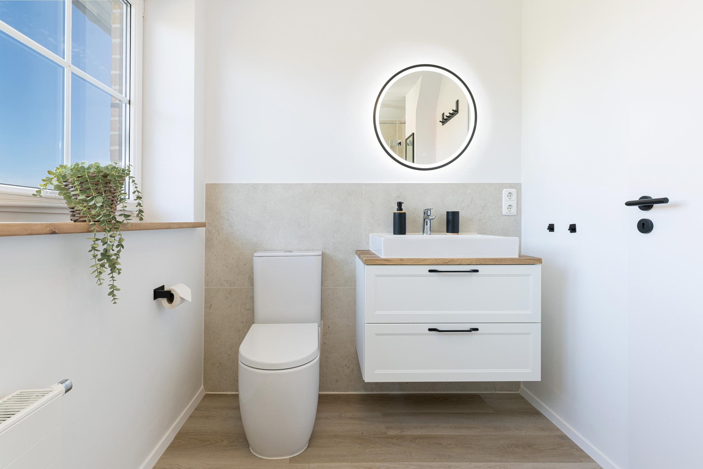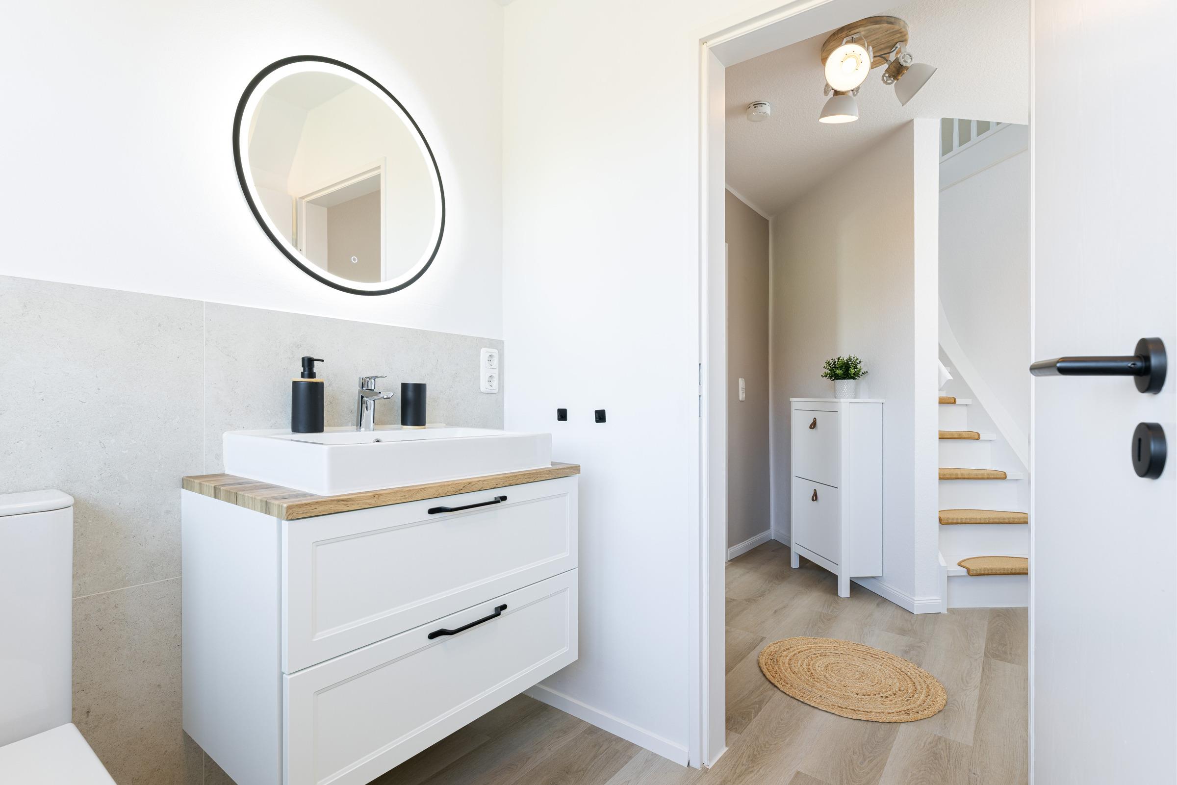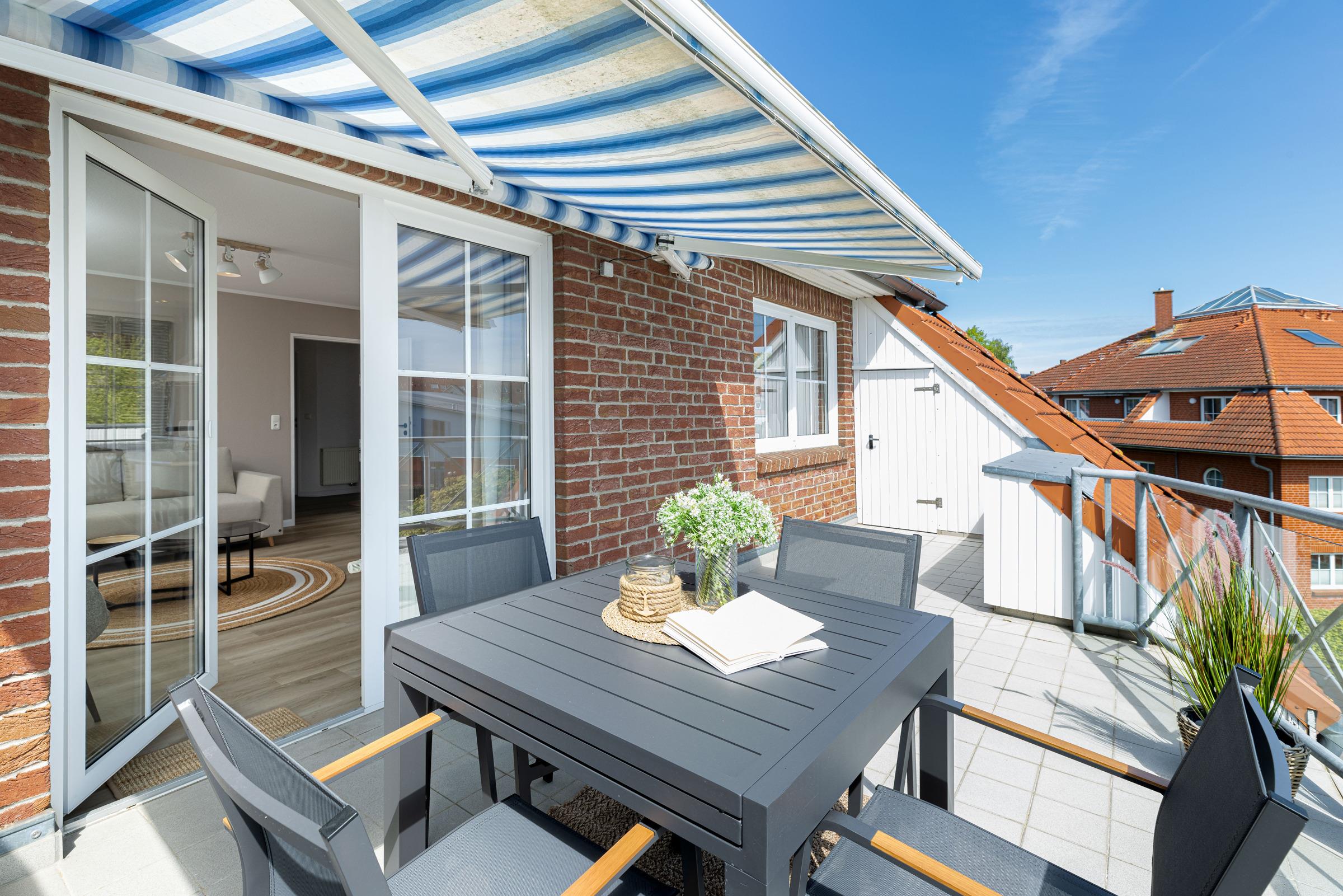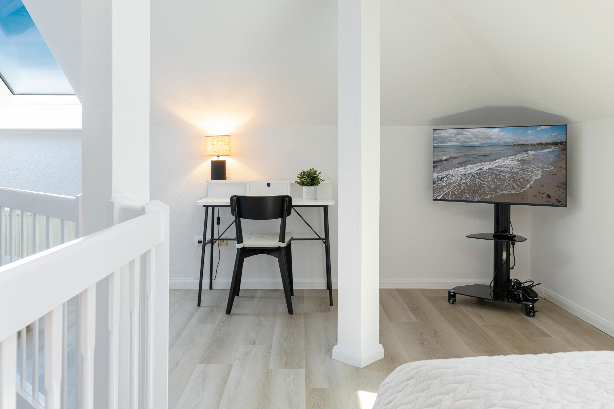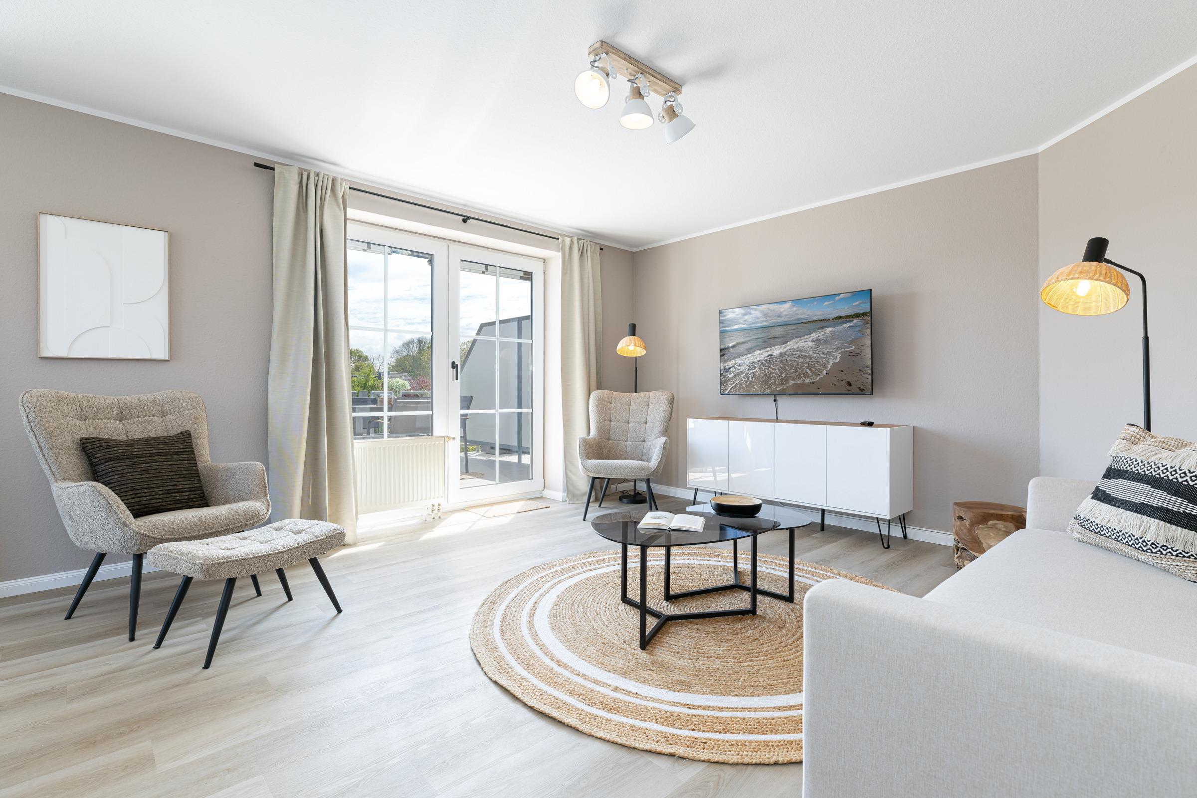 Moderne Maisonette-Ferienwohnung Flat White in Laboe mit zwei Balkonen und Meerblick für erholsame Urlaubstage.