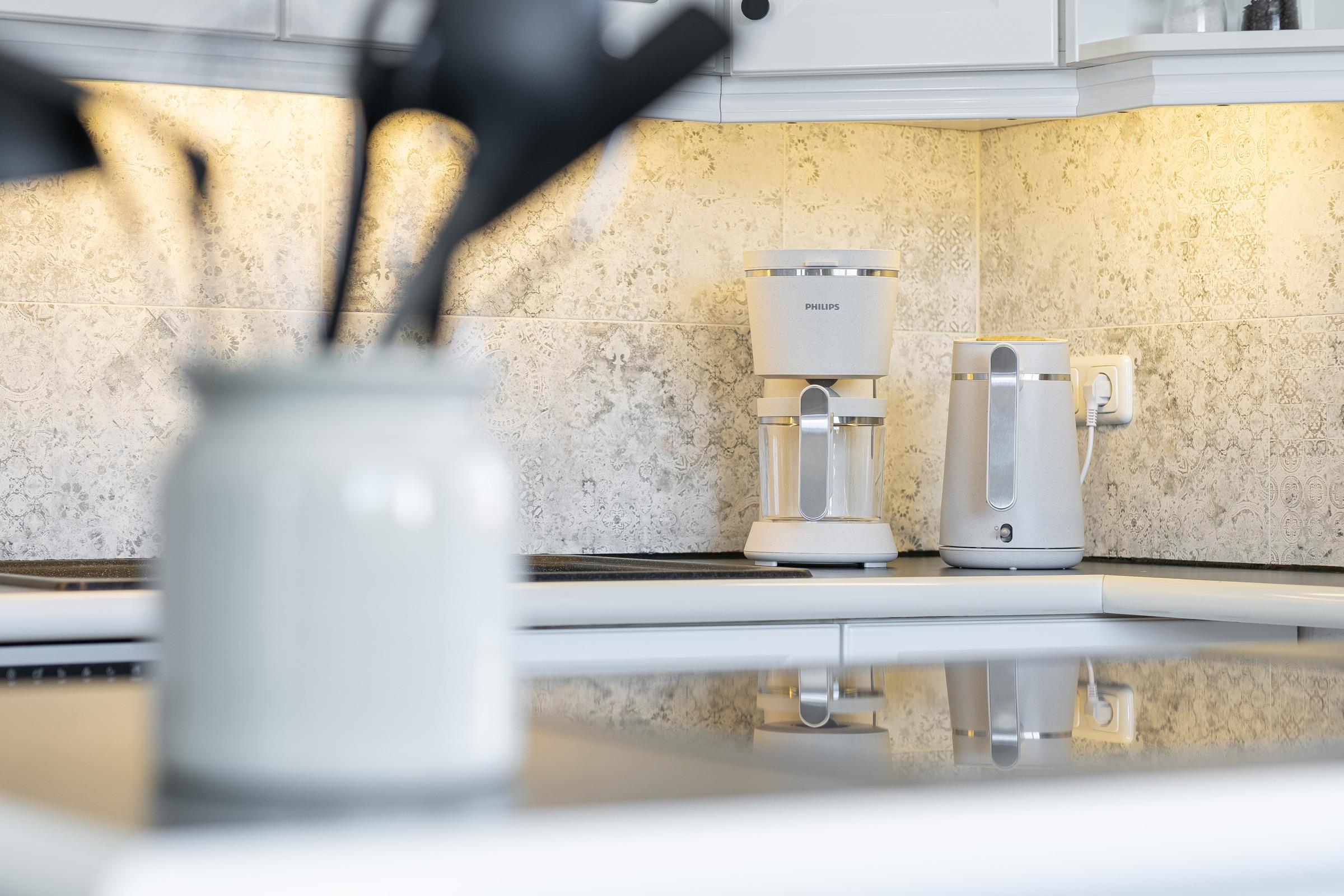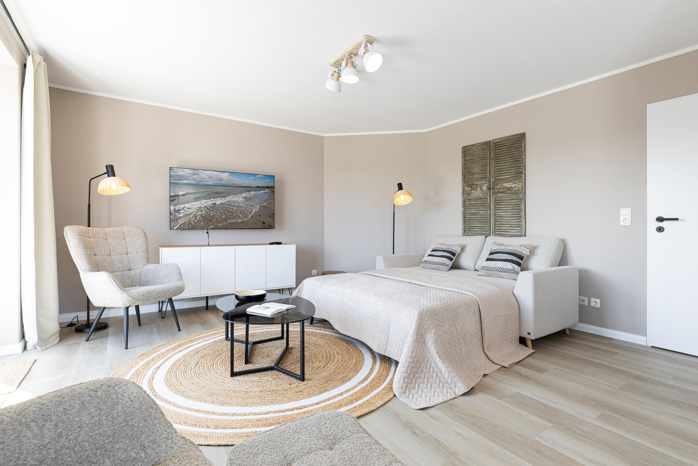 Die Wohnung heißt Sie herzlich willkommen im gemütlichen Wohnzimmer, das abends zwei Schlafplätze auf dem komfortablen Schlafsofa (160x200 cm) bietet. Für aktive Urlauber sind Yoga-Matten und Equipment vorhanden. Die gut ausgestattete Küchenzeile mit Kapselmaschine (Nespresso) und Mikro-Back-Kombigerät ist nur wenige Schritte entfernt und führt Sie auf den Balkon mit Ost-Ausrichtung - dem morgendlichen Kaffee mit Blick in Richtung Sonnenaufgang steht hier nichts im Wege. Wer noch nicht genug hat, folgt der Sonne im Tagesverlauf auf den Wohnzimmer Balkon mit der Ausrichtung nach Süden. Ein Elektrogrill ist vorhanden.