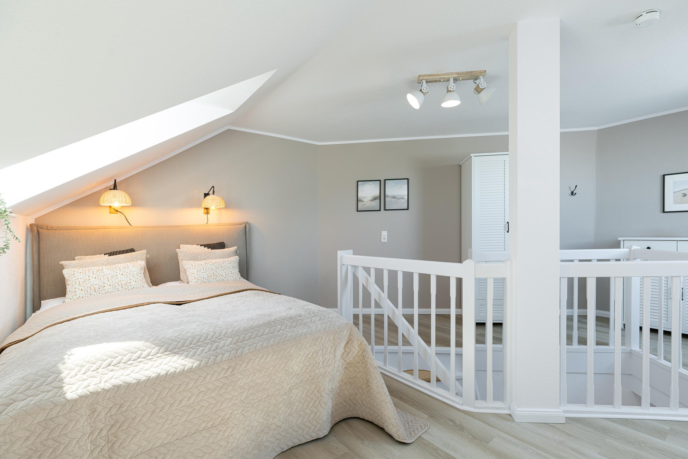 Für die Nacht steht Ihnen ein gemütliches Schlafzimmer mit TV, Kleiderschrank und Boxspringdoppelbett (2x 80x200 cm) zur Verfügung. Den Strandsand können Sie sich im modernen Badezimmer abwaschen, damit Sie gewappnet sind für die nächsten Urlaubstage. In der Wohnung steht Ihnen ein Waschtrockner zur Verfügung. Für Familien ist ein Kinderhochstuhl und ein Kinderreisebett in der Unterkunft vorhanden.