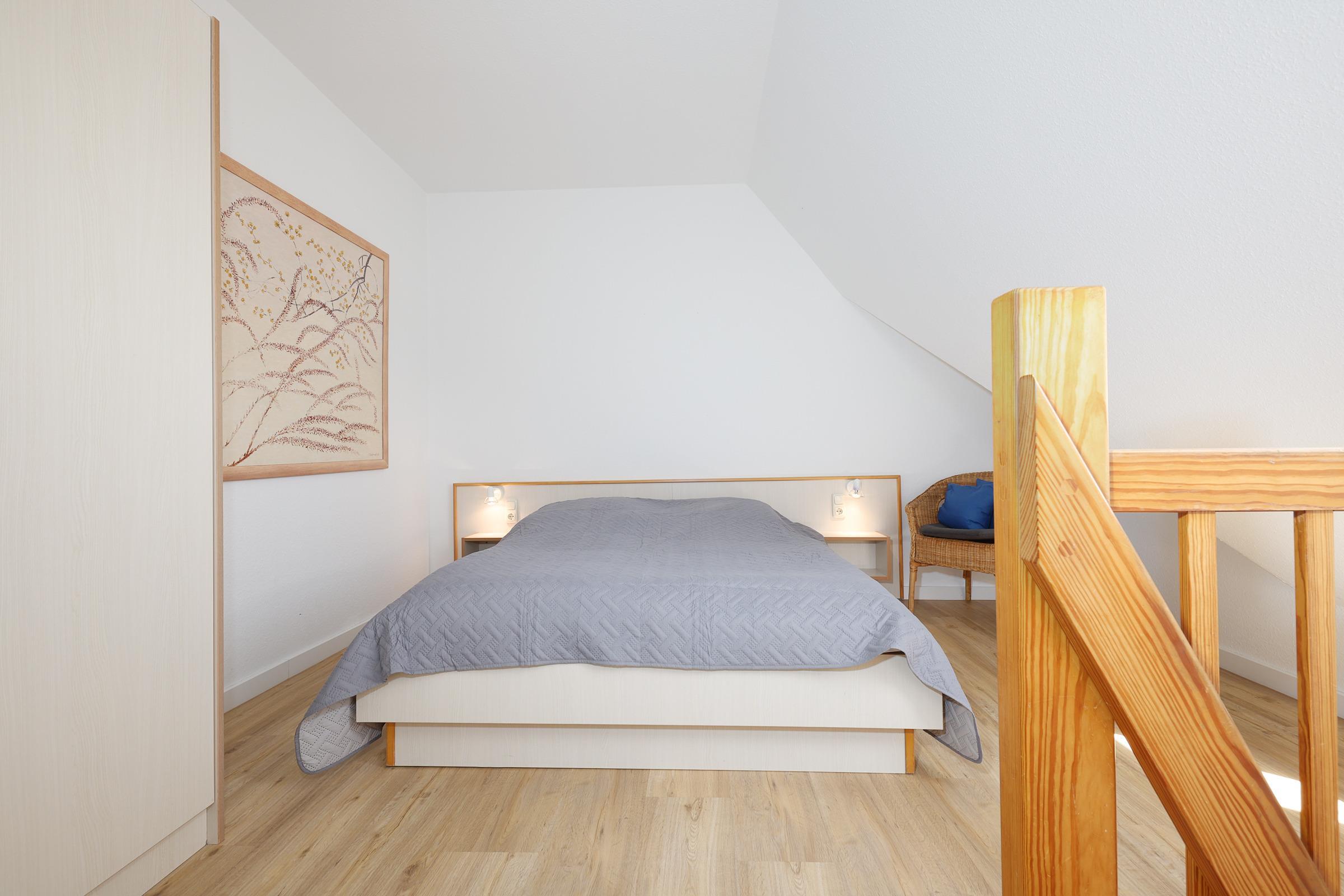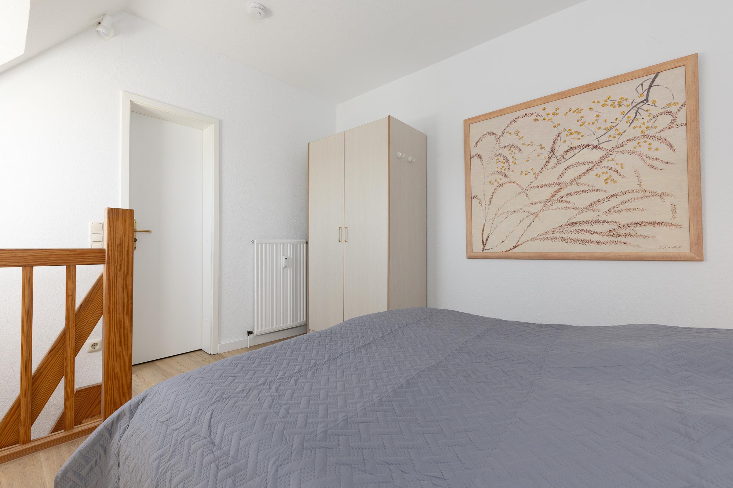 Der schöne Ausblick reicht von der Außenförde mit Leuchtturm, Surfrevier und Ehrenmal über das Stadtpanorama mit Windmühle bis zum Yachthafen. Der Schlafraum ist über eine Sambatreppe (Raumspartreppe) zu erreichen. Gäste, die es bequemer haben möchten, können auch den gesonderten Eingang direkt vom Treppenhaus mit Vorflur benutzen.