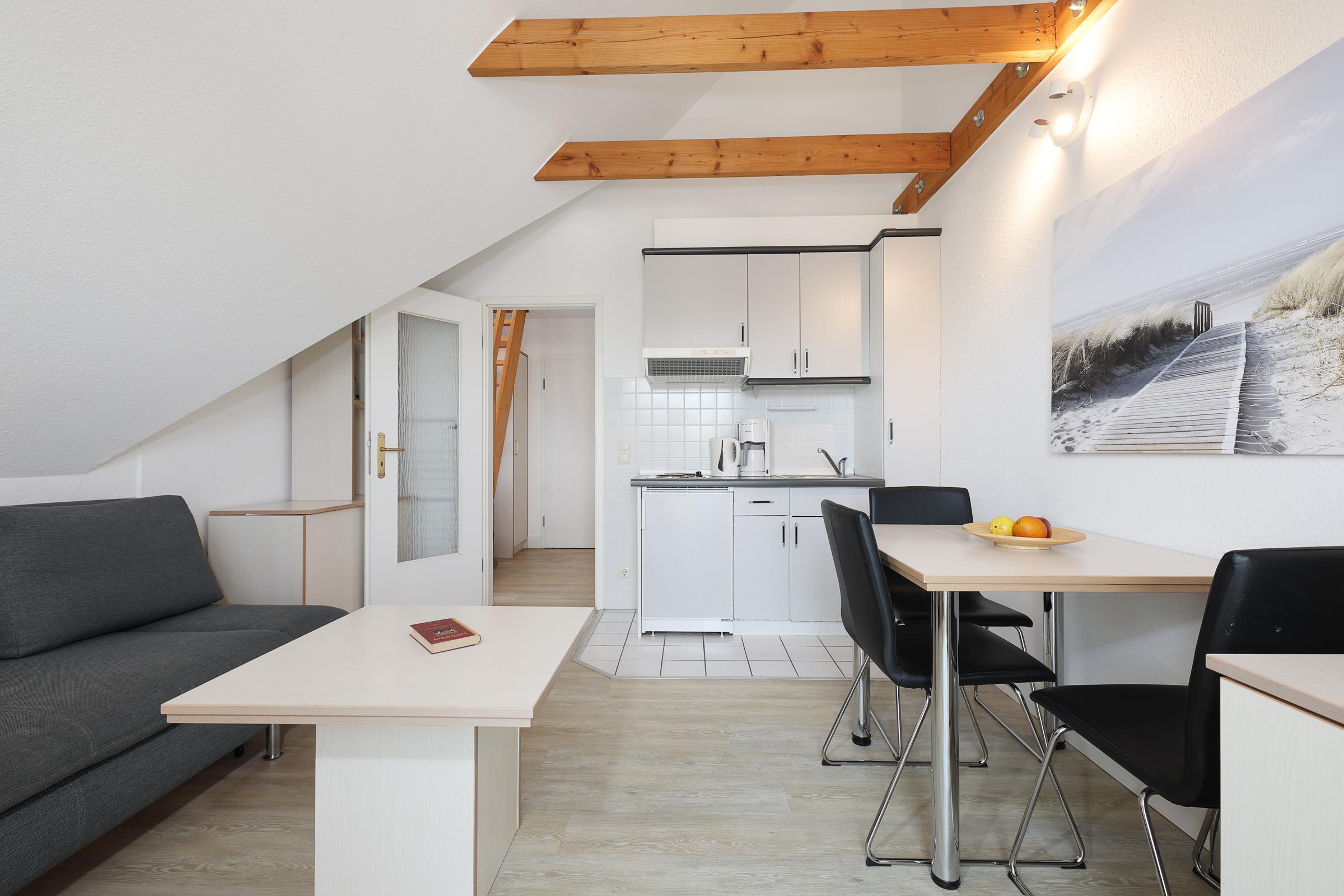 Die Maisonette-Ferienwohnung mit ca. 38m² Wohnfläche befindet sich in der 3. und 4. Etage des Strandhotels zur Landseite, direkt an der Strandpromenade und dem weitläufigen, wunderschönen Sandstrand von Laboe. Hier finden bis zu 3 Personen ausreichend Platz.