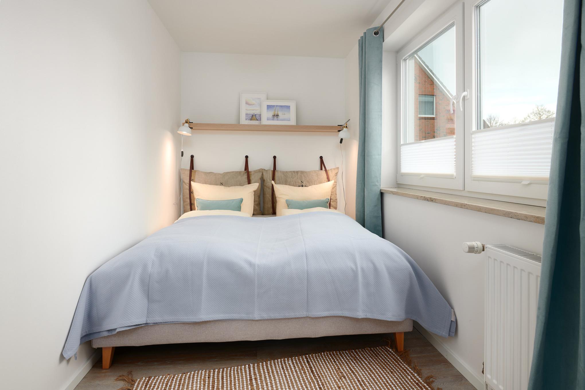 Schlafzimmer 1 (EG): 1 Doppelbett (2x 90x200 cm), Kleiderschrank, TV, Verdunkelung: Plissee und Gardinen, Platz für ein Babybett vorhanden