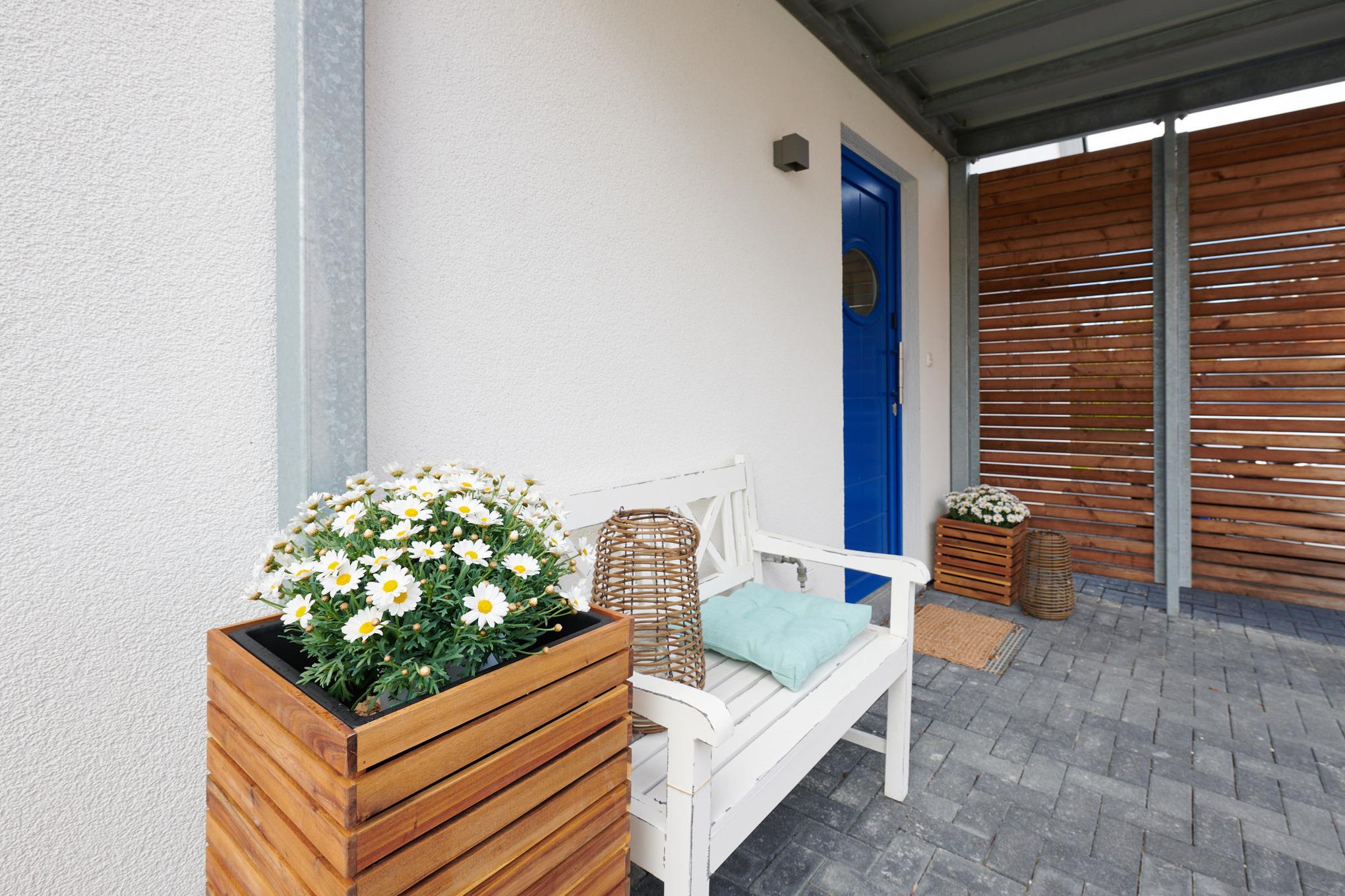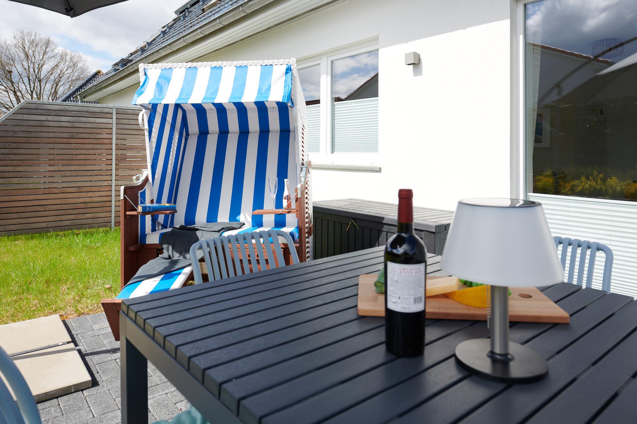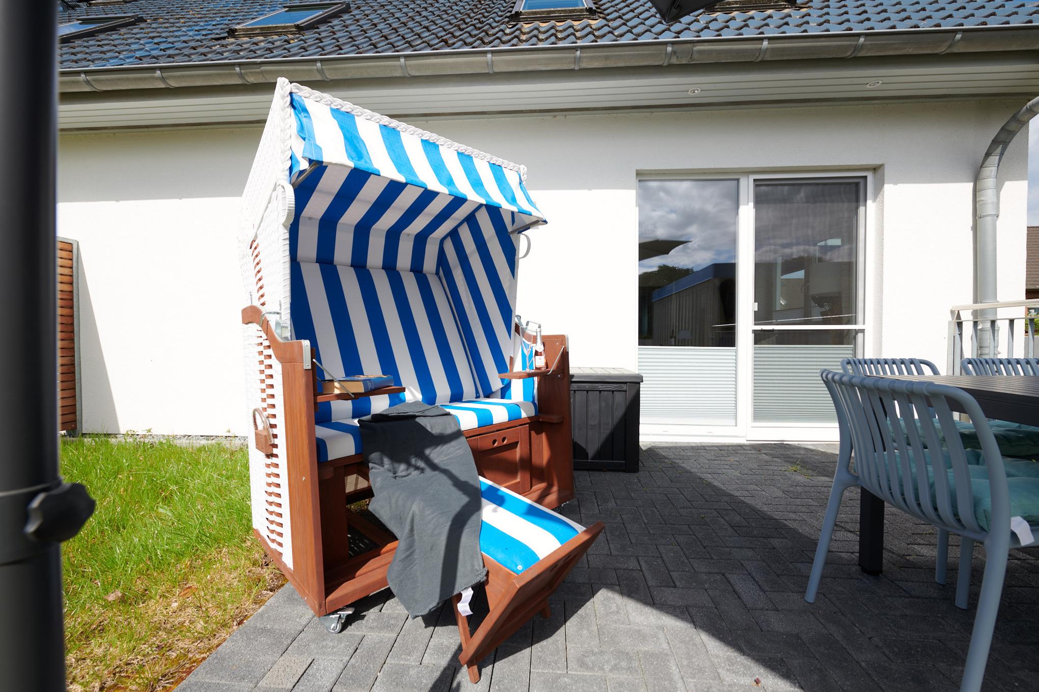 Moderne Ferienwohnung mit Terrasse und Strandkorb in Laboe, ideal für erholsamen Urlaub an der Kieler Förde.