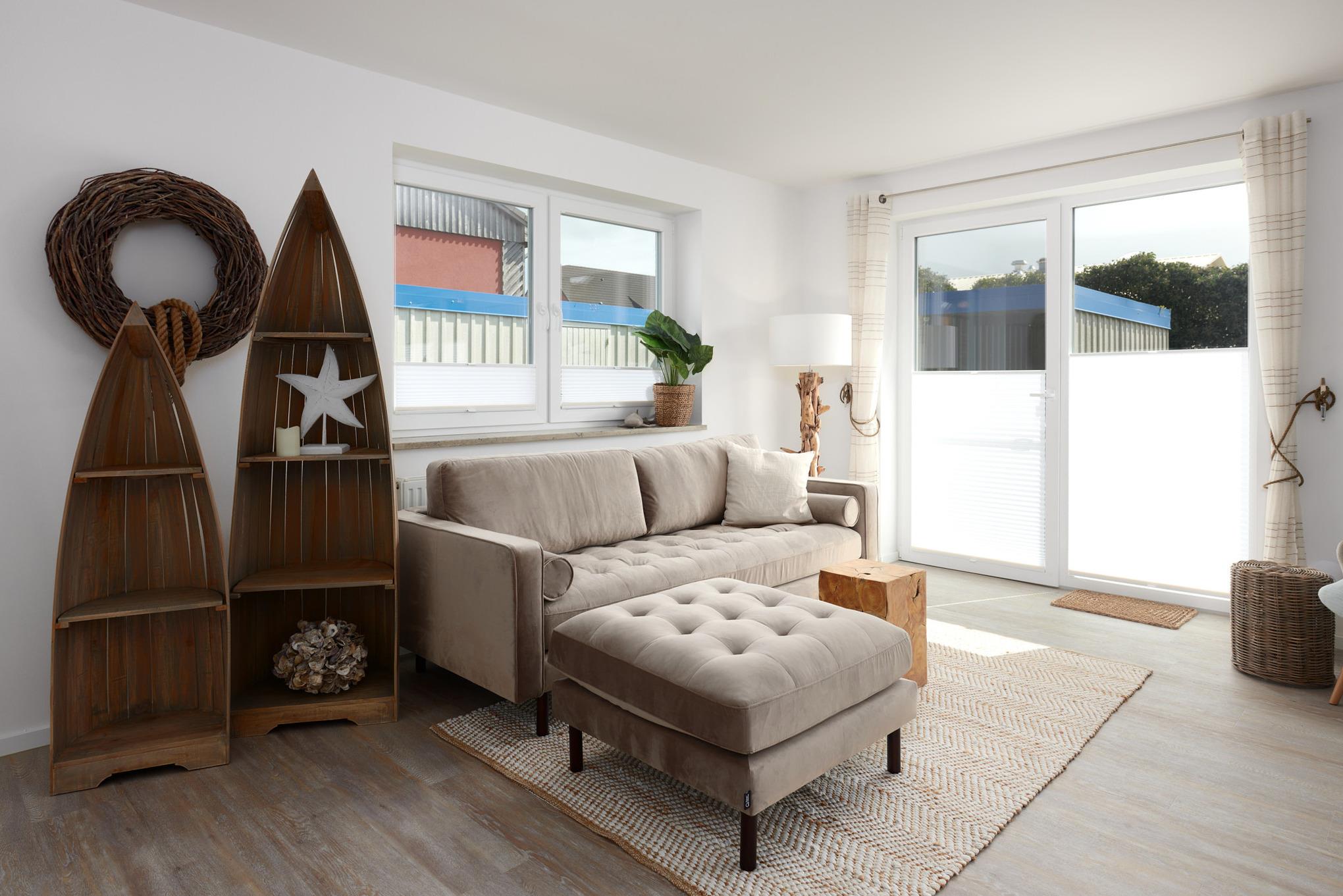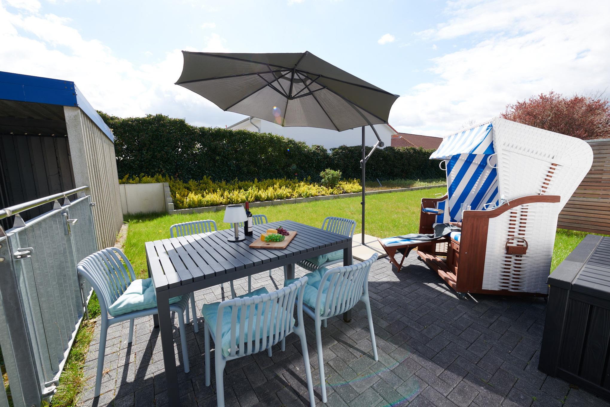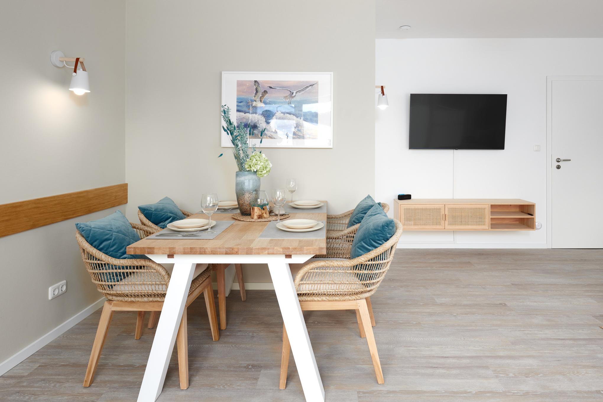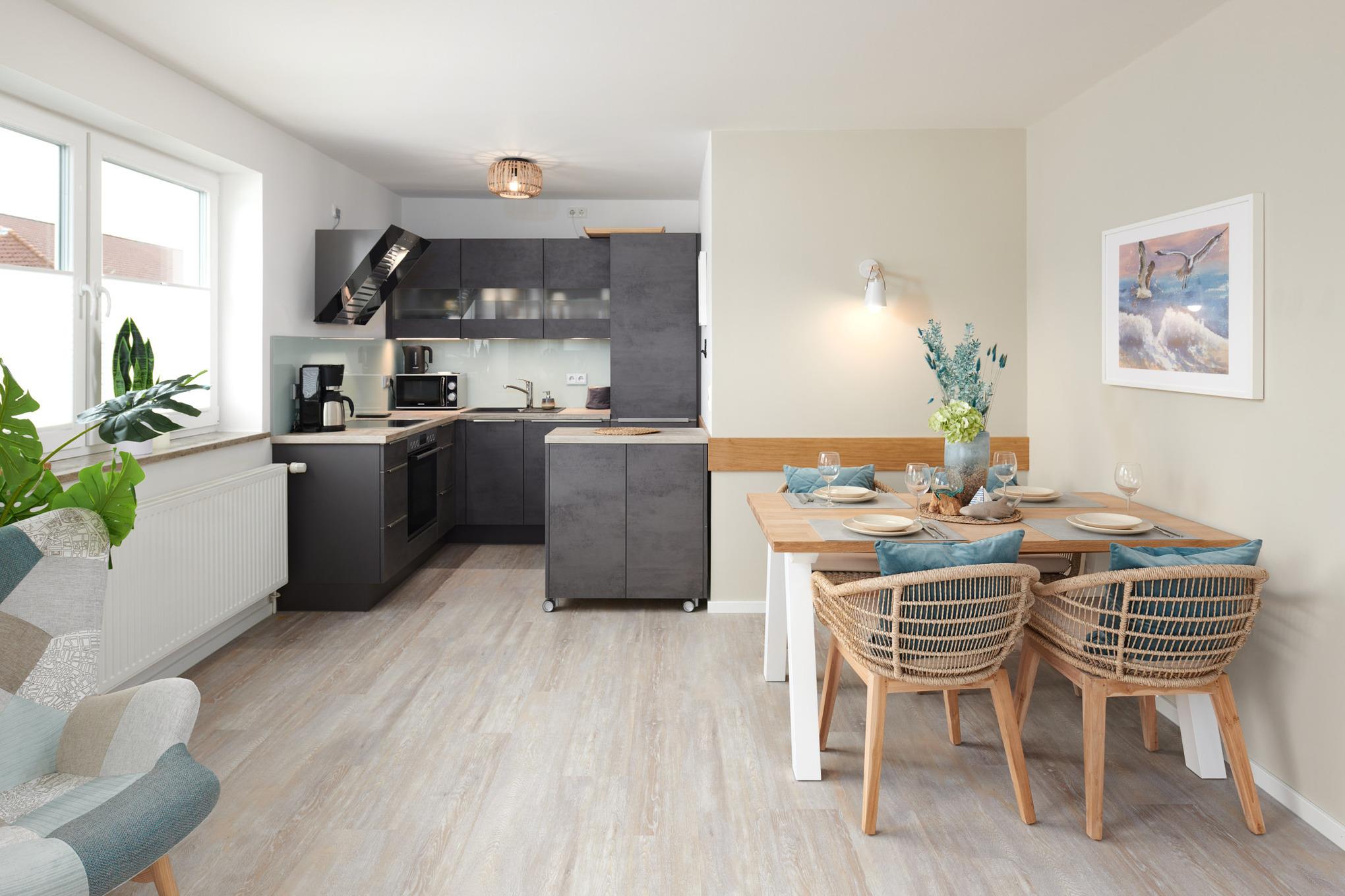 Die stilvolle Ferienwohnung überzeugt mit einem modernen Wohnbereich, der mit gemütlicher Sitzgruppe und großem Flatscreen-TV zum Entspannen einlädt. Von hier aus gelangen Sie direkt auf die sonnige Terrasse, die nach Süd-Ost ausgerichtet ist und mit Gartenmöbeln und einem Strandkorb zum Frühstück im Freien oder entspannten Stunden am Abend einlädt. Auch Grillen ist hier erlaubt. Die offene Küche ist voll ausgestattet und bietet neben einem Backofen, Induktionsherd, Geschirrspülmaschine und Kühlschrank auch eine Mikrowelle, Kaffeemaschine und Toaster – ideal für die Selbstversorgung im Urlaub. Im Essbereich finden alle Gäste bequem Platz. Zwei separate Schlafzimmer, jeweils mit komfortablen Doppelbetten ausgestattet, sorgen für erholsame Nächte. Das Badezimmer bietet eine bodengleiche Dusche, WC, Haartrockner, Kosmetikspiegel sowie einen beheizbaren Handtuchhalter und lässt keine Wünsche offen.