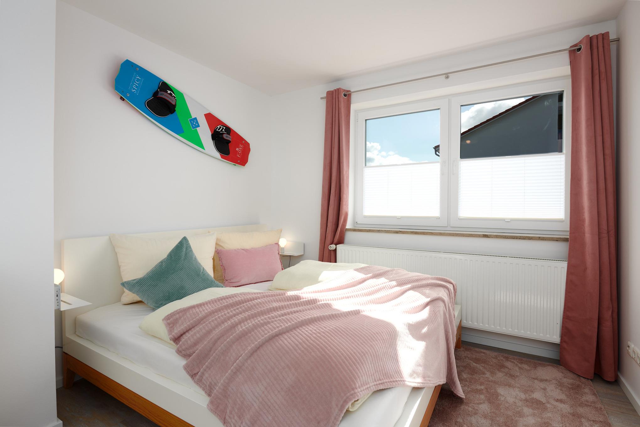 Schlafzimmer 2 (EG): 1 Doppelbett (180x200 cm), Kleiderschrank, Verdunkelung: Plissee & Vorhänge, Platz für ein Babybett vorhanden