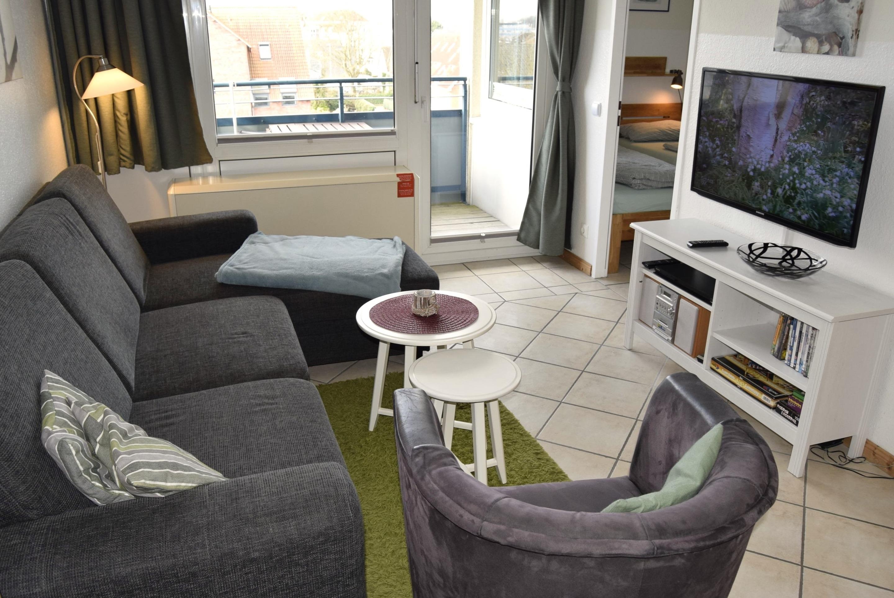 Durch den Flur erreichen Sie das Badezimmer und das modern eingerichtete Wohnzimmer, von dem die kleine Küche sowie die beiden Schlafzimmer abgehen. Die Wohnung bietet ausreichend Platz für vier Personen. Als Schlafgelegenheiten stehen in den beiden Schlafzimmern je zwei Einzelbetten zur Verfügung. Es stehen zwei Parkraumflächen neben dem Haus zur Verfügung. Die Plätze sind nicht fest zugeteilt (je nach Verfügbarkeit). Für Fahrräder stehen zwei abschließbare Räume zur gemeinschaftlichen Nutzung zur Verfügung.
