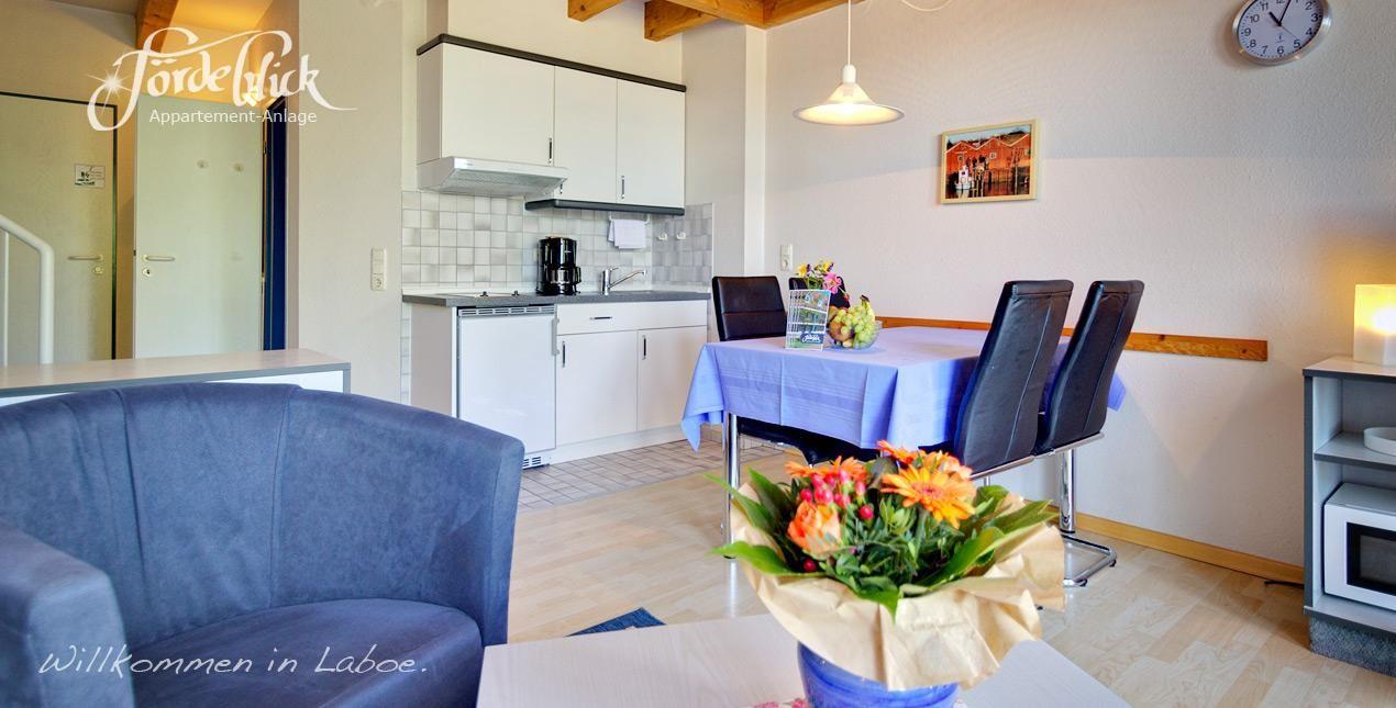 Dieses Galerie-Appartement ist ca. 50qm groß und im Maisonetten-Stil erbaut .Vom Wohn- Essraum erreicht man über eine Wendeltreppe den Schlafbereich auf der offenen Galerie. Ein Doppelbett je 90cm breit, unter dem holzverkleideten Dach bietet ein sehr gemütliches Ambiente. Im Wohn- Essraum bietet eine bequeme Schlafcouch Platz für zwei weitere Personen. Die gut eingerichtete Küchenzeile mit einem Ceranfeld und Kühlschrank sowie Kaffeemaschine und Wasserkocher gehört mit dazu. Eine große 3m breite und raumhohe Fensterfront lässt die Wohnung hell und freundlich erscheinen. Schon von dieser Fensterfront aus können Sie auf die Kieler Förde schauen. Vom gemütlichen Dachbalkon genießen Sie eine herrliche Aussicht auf die See mit den vorbeifahrenden großen "Pötten" Hier werden Sie Ihren Urlaub in Laboe sehr genießen.