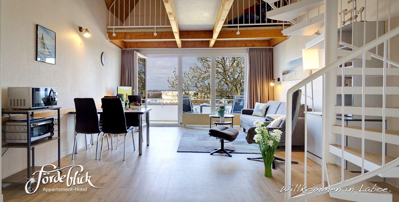 Dieser besonders geräumige Appartement-Typ ist im Maisonette-Stil über zwei Etagen gehalten. Es ist sehr schön eingerichtet und verfügt über ein großzügiges Wohn-Esszimmer mit einer komfortablen Doppelbettcouch für zwei Personen, eine Essecke, und ein Duschbad mit WC. Über eine Wendeltreppe erreichen Sie die Galerie Dort befindet sich ein weiteres Badezimmer mit Badewanne und WC. Sowie ein separates Schlafzimmer mit einem Doppelbett. Mit der gut eingerichteten Küchenzeile mit Ceranfeld, Kühlschrank und Mikrowelle lassen sich leckere Speisen zubereiten. Der gemütliche Dachbalkon bietet einen wunderschönen Blick auf die Ostsee mit den vorbeiziehenden großen Schiffen. Genießen Sie von dort zum Tagesausklang den Sonnenuntergang. Sie werden begeistert sein.