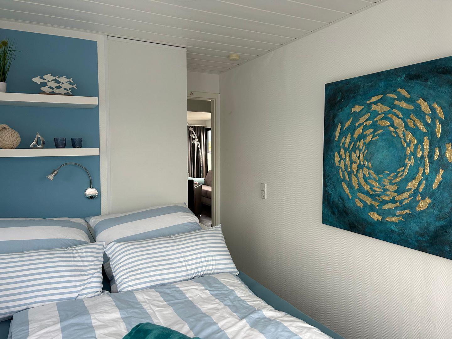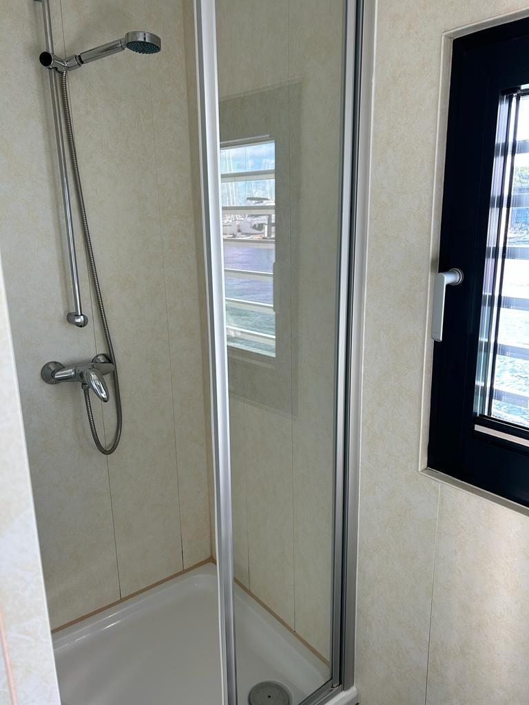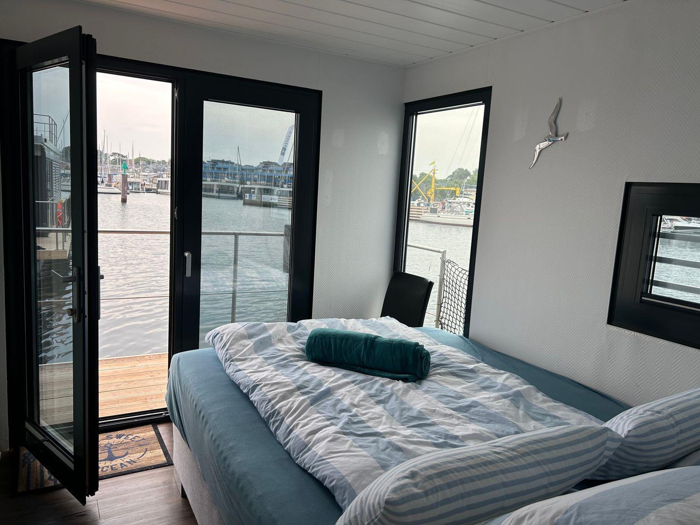 Sie verfügen über einen großzügigen Wohnbereich mit integrierter, gut-ausgestatteter Küchenzeile und direktem Zugang zur 15 qm großen Terrasse am Bug, sowie zwei Schlafzimmern.