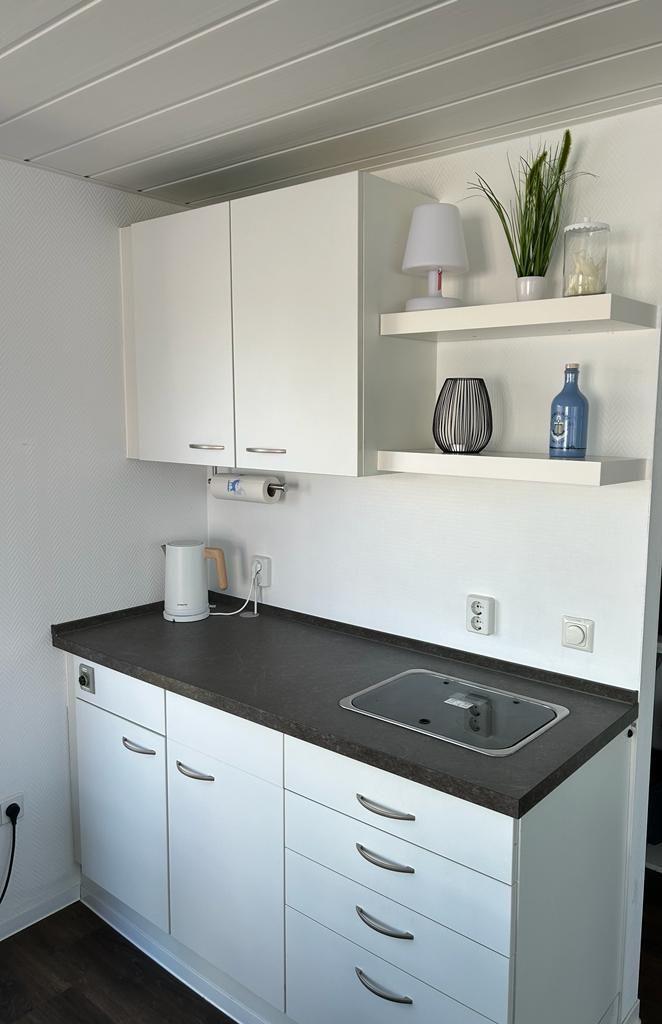 Mikrowelle, Spülmaschine, Kühlschrank mit Gefrierfach, Ceranfeld (2-flammig), Kaffeemaschine, Toaster, Wasserkocher, Spüle