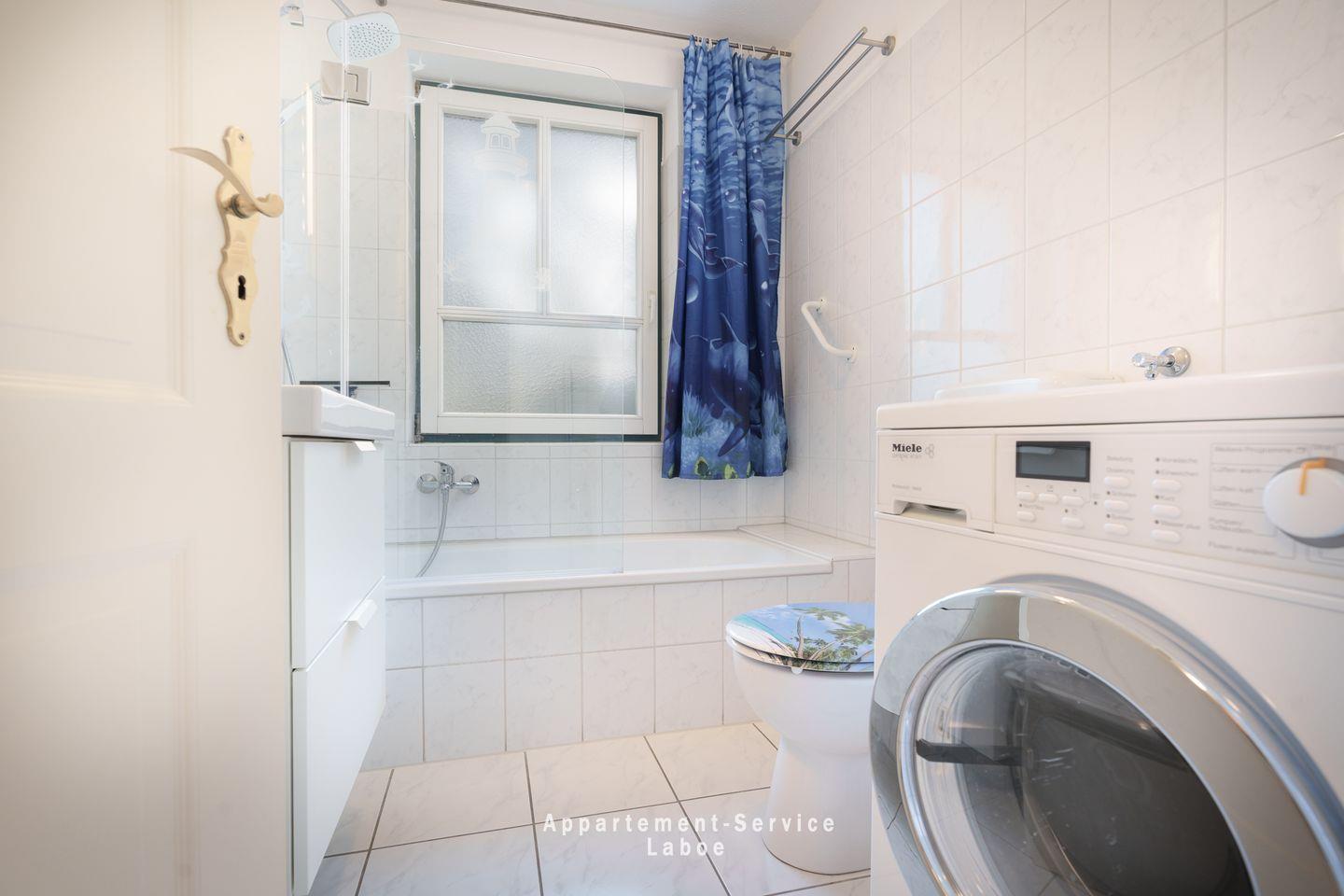 FeWo Knotenpunkt: 50?m² große Ferienwohnung für ein bis zwei Personen in ruhiger Lage nahe dem Ehrenmal in Laboe. Helle Hochparterre-Wohnung mit Wohn-/Essbereich, Balkon, voll ausgestatteter Küchenzeile (Ceranfeld, Backofen, Mikrowelle, Spülmaschine, Kühlschrank mit Gefrierfach). Separates Schlafzimmer mit Boxspringbett, Badezimmer mit Badewanne (inkl. Duschmöglichkeit), Waschmaschine und Bügelequipment. WLAN und Tiefgaragenstellplatz vorhanden. Strand, Restaurants und Cafés sind fußläufig erreichbar.
