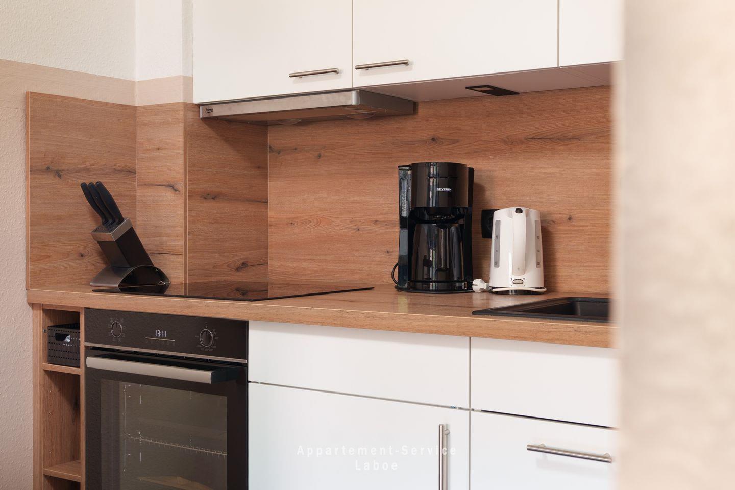 Auf ca. 44?m² bietet dir die Ferienwohnung einen offenen Wohnbereich mit gemütlicher Couch, Esstisch, Fernseher, HiFi-Anlage und WLAN – perfekt für entspannte Abende nach einem Tag am Meer. Die integrierte Küchenzeile ist modern ausgestattet, mit Ceranfeld, Backofen, Kühlschrank mit Gefrierfach, Wasserkocher und Kaffeemaschine – alles da, was du brauchst, um dich selbst zu versorgen.
