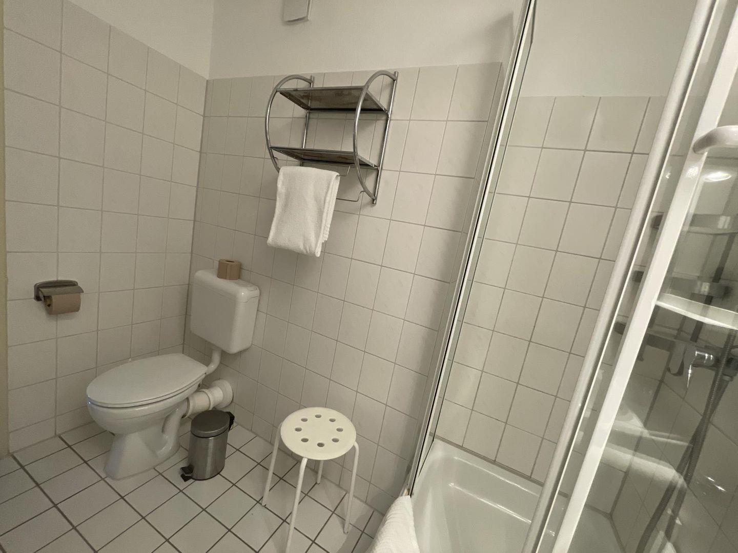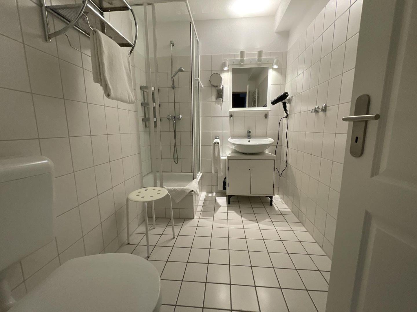 Das Badezimmer ist modern, mit Dusche, WC, Haartrockner und Kosmetikspiegel – alles da für einen guten Start in den Tag. Und wenn zwischendurch mal gewaschen werden muss: Im Haus findest du Waschmaschine und Trockner zur Mitnutzung.