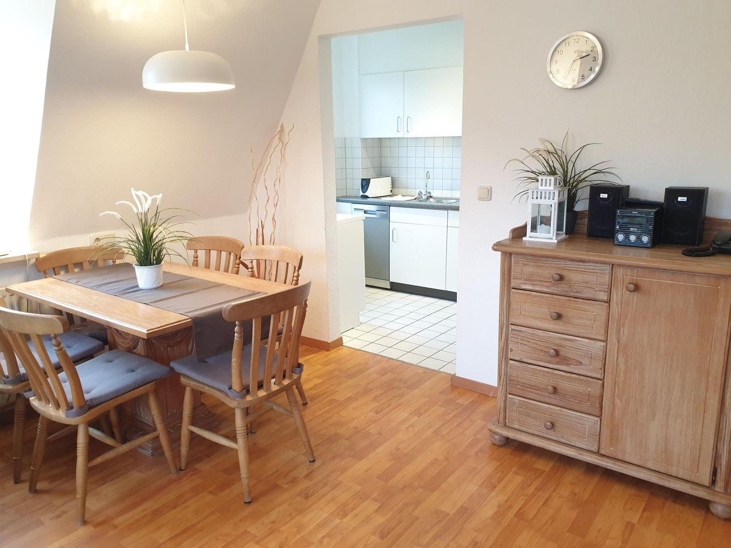 Das Wohnzimmer ist groß und hell – mit bequemer Sitzecke, Essbereich für lange Frühstücke oder Spieleabende und einer warmen, entspannten Atmosphäre. In der Küche findest du alles, was du brauchst: Herd, Backofen, Spülmaschine, Kaffeemaschine und Co. – ideal für alle, die auch im Urlaub gern mal was Selbstgekochtes auf dem Teller haben.