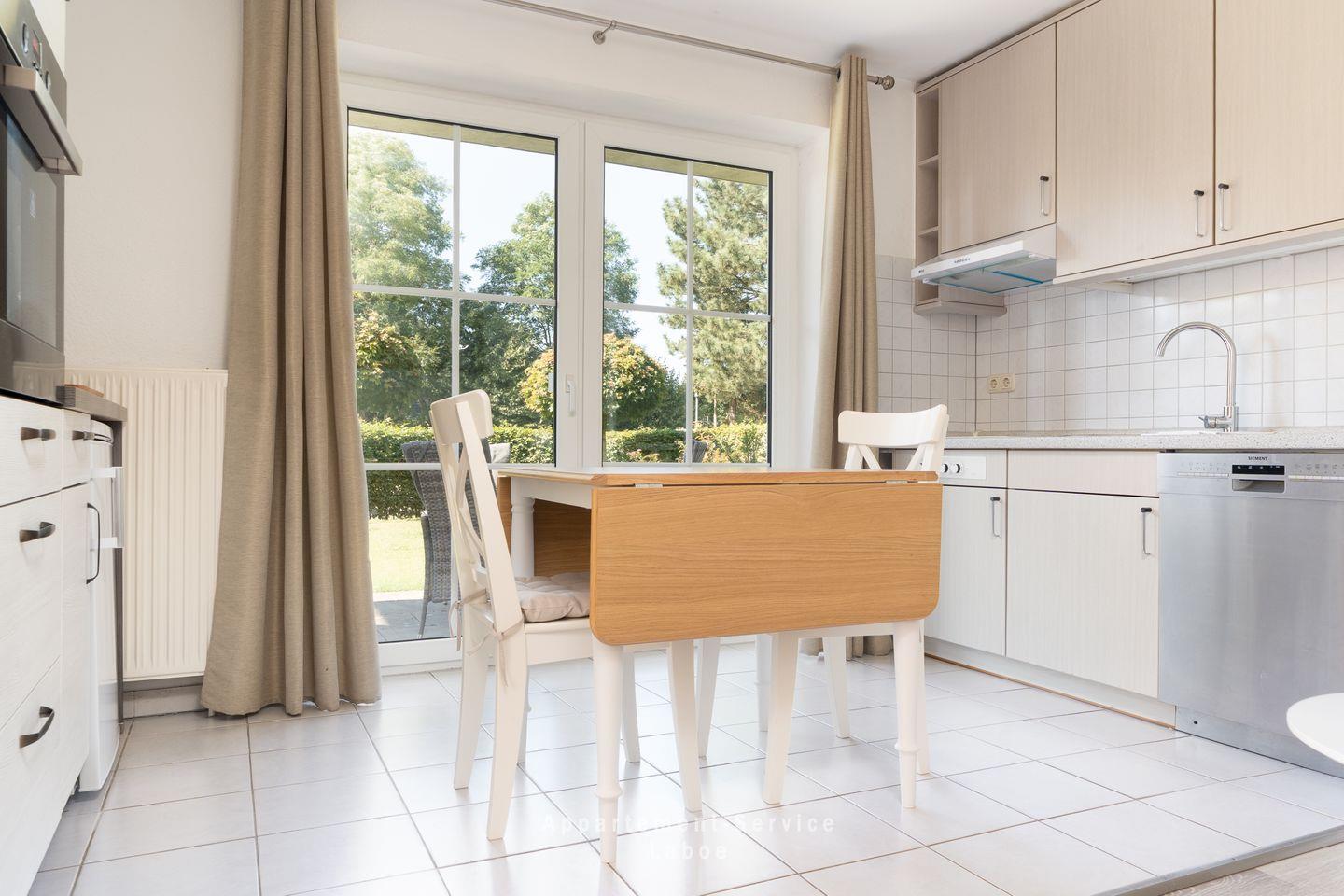 Die offene Küchenzeile ist ein kleines Highlight: Praktisch, modern und mit allem ausgestattet, was du brauchst. Ob ein schnelles Frühstück oder ein ausgedehntes Abendessen – hier macht Kochen Spaß. Der Essplatz direkt daneben lädt zu entspannten Mahlzeiten ein, vielleicht mit einem Glas Wein und Blick auf die Terrasse. Apropos Terrasse: Sie ist das Herzstück dieser Wohnung. Mach es dir im Strandkorb bequem, atme die frische Meeresluft ein und lass einfach die Seele baumeln. Hier kannst du die Sonne genießen oder den Tag ganz entspannt ausklingen lassen – mehr Urlaubsgefühl geht nicht.