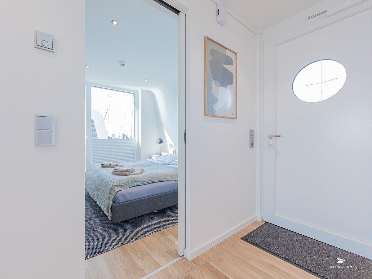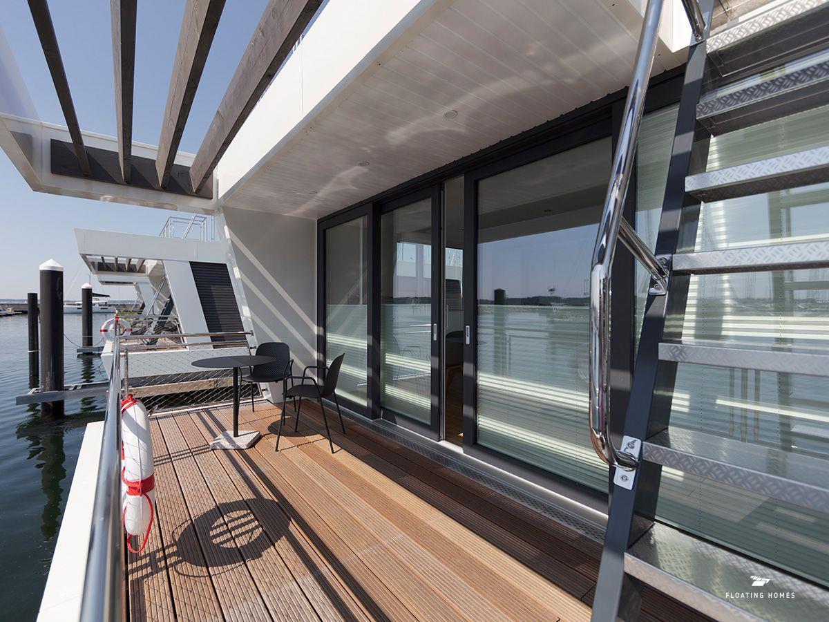 Erleben Sie stilvolles Wohnen auf dem Hausboot Kielwasser im Hafen von Laboe mit Sauna und Panoramadeck.