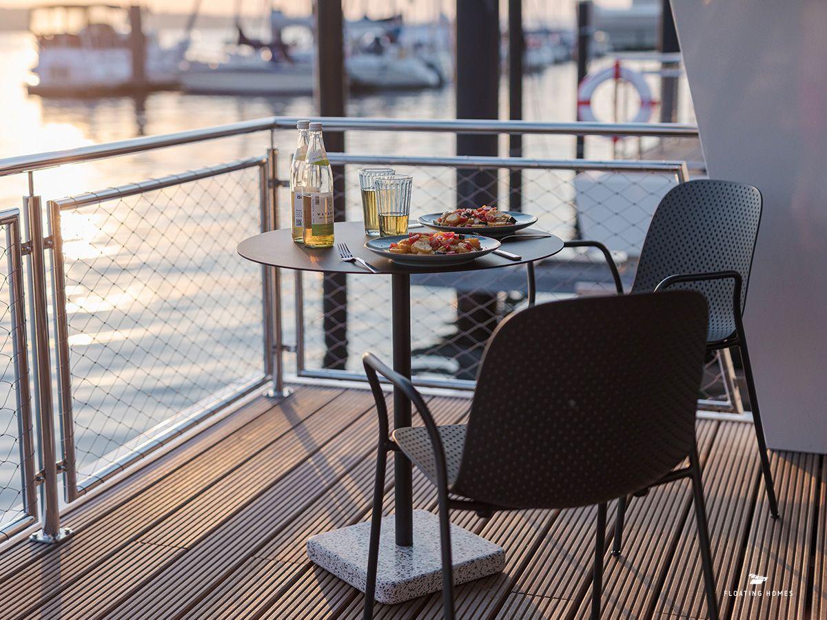 Von der kleinen Terrasse führt dich eine Treppe hinauf auf das beeindruckende Panoramadeck, ausgestattet mit Lounge-Möbeln und einer Aussicht, die dir den Atem rauben wird. Ob zum Sonnenbaden, für ein Frühstück mit Blick auf den Hafen oder einfach, um den Segelbooten zuzusehen – hier erlebst du „Meer“ in seiner schönsten Form.