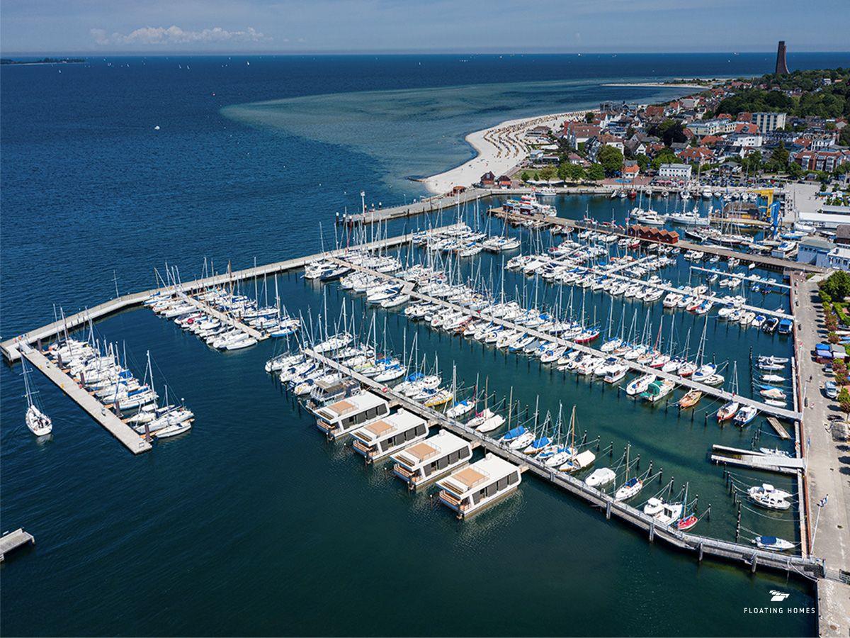 Erleben Sie maritimen Luxus auf dem stilvollen Hausboot Kielwasser im Hafen von Laboe mit Sauna und Panoramadeck.