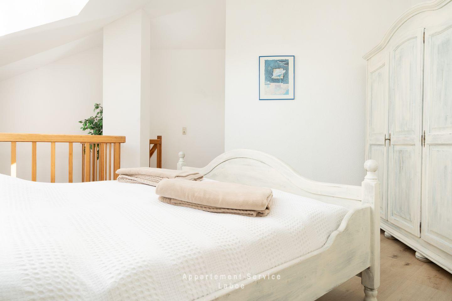 Auf der offenen Galerie befindet sich das Schlafzimmer mit einem komfortablen Doppelbett. Die Gestaltung der Maisonette sorgt dafür, dass dieser Bereich angenehm großzügig wirkt und gleichzeitig Privatsphäre bietet – ein wunderbarer Rückzugsort nach einem langen Tag am Strand.