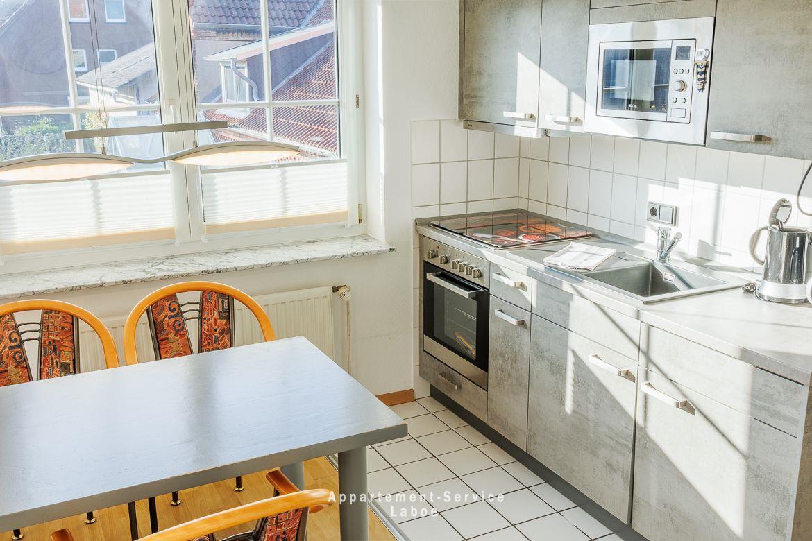 FeWo Bellevue W06: 2-Zimmer-Wohnung, ca. 40?m², für 2–4 Personen. 1. Stock mit Balkon zur Seitenstraße. Wohnzimmer mit Schlafcouch, TV, WLAN, Essbereich und offener Küche (Ceranfeld, Backofen, Kühlschrank mit Gefrierfach, Kaffeemaschine). Schlafzimmer mit Doppelbett. Duschbad. Tiefgaragenstellplatz (Duplex: max. 5,00?m?L × 2,00?m?B × 1,50?m?H). Waschmaschine und Trockner im Haus. Strand, Promenade und Einkauf fußläufig. Strandkorb inklusive. Haustiere erlaubt.