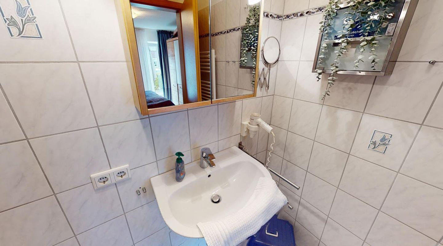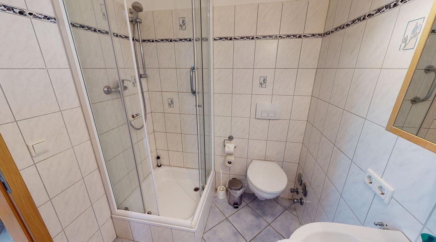 Im separaten Schlafzimmer findest du Ruhe für erholsame Nächte. Das Badezimmer ist modern ausgestattet mit Dusche, WC, Föhn und Kosmetikspiegel – praktisch und gepflegt.