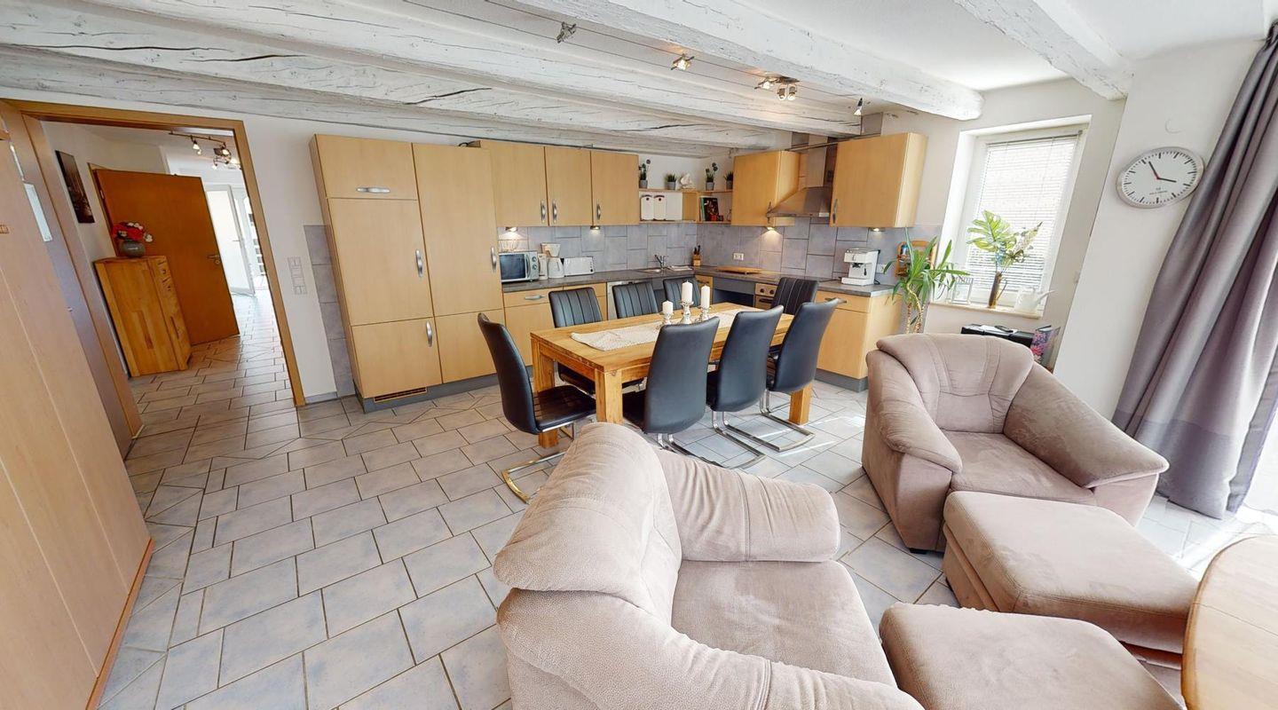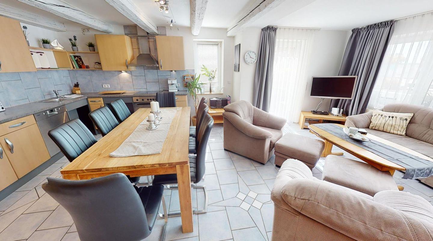 Der offene Wohnbereich verbindet Küche, Esstisch und Sofaecke zu einem Ort, an dem man gern zusammenkommt. In der gut ausgestatteten Küche findest du Cerankochfeld, Backofen, Mikrowelle, Spülmaschine und Kaffeemaschine – perfekt für ein ausgedehntes Frühstück oder ein gemeinsames Abendessen. Drei Fernseher sorgen bei jedem Wetter für Unterhaltung.