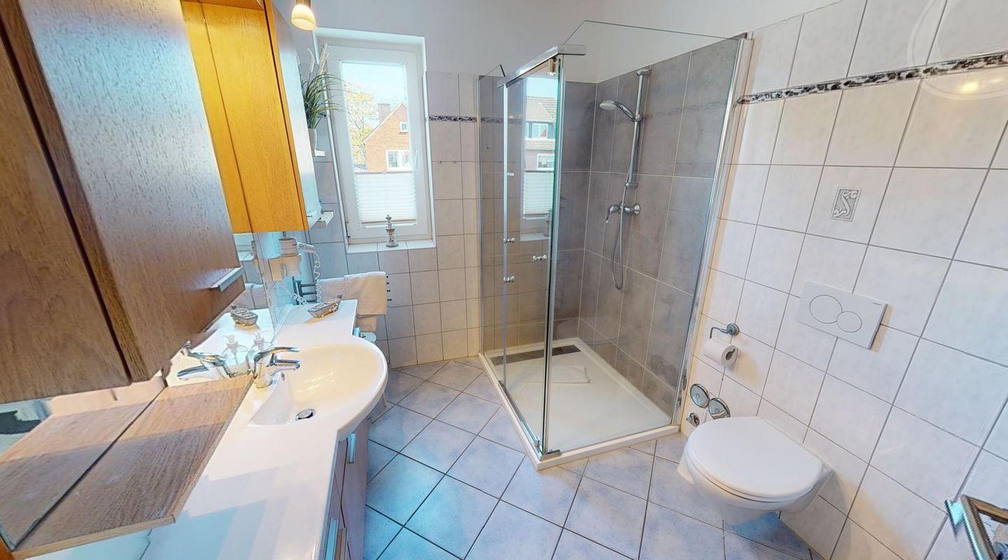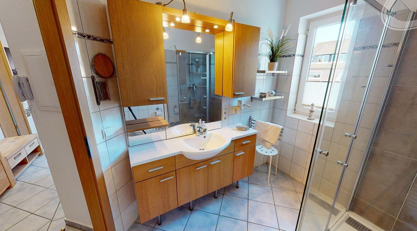 Das moderne Badezimmer ist mit einer bodengleichen Dusche ausgestattet – bequem, barrierearm und hochwertig eingerichtet. Für entspannte Kochabende bietet dir die offene Küche alles, was du brauchst: Cerankochfeld, Backofen, Mikrowelle, Spülmaschine und Kaffeemaschine. Am großen Esstisch ist Platz für gemeinsame Mahlzeiten, Kartenspiele oder Urlaubspläne. Die gemütliche Sofaecke mit Sessel lädt zum Ausruhen ein – drei Fernseher und eine HiFi-Anlage sorgen bei Bedarf für Unterhaltung.