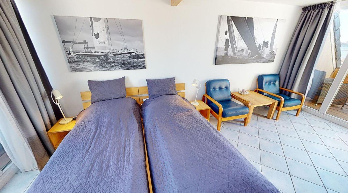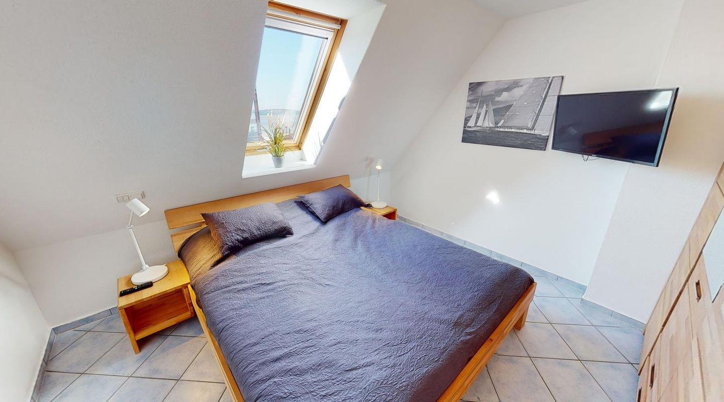 Drei gemütliche Schlafzimmer bieten ausreichend Rückzugsmöglichkeiten: Zwei davon sind mit komfortablen Doppelbetten ausgestattet, im dritten findest du zwei Einzelbetten. Von diesem Schlafzimmer aus erreichst du gleich zwei überdachte Loggien – eine zur Gartenseite mit grünem Ausblick und eine zur Fördeseite mit traumhaftem Meerblick. Zusätzlich steht dir im Wohnzimmer ein komfortables Doppelschrankbett zur Verfügung, das sich mit wenigen Handgriffen in einen vollwertigen Schlafplatz verwandeln lässt.