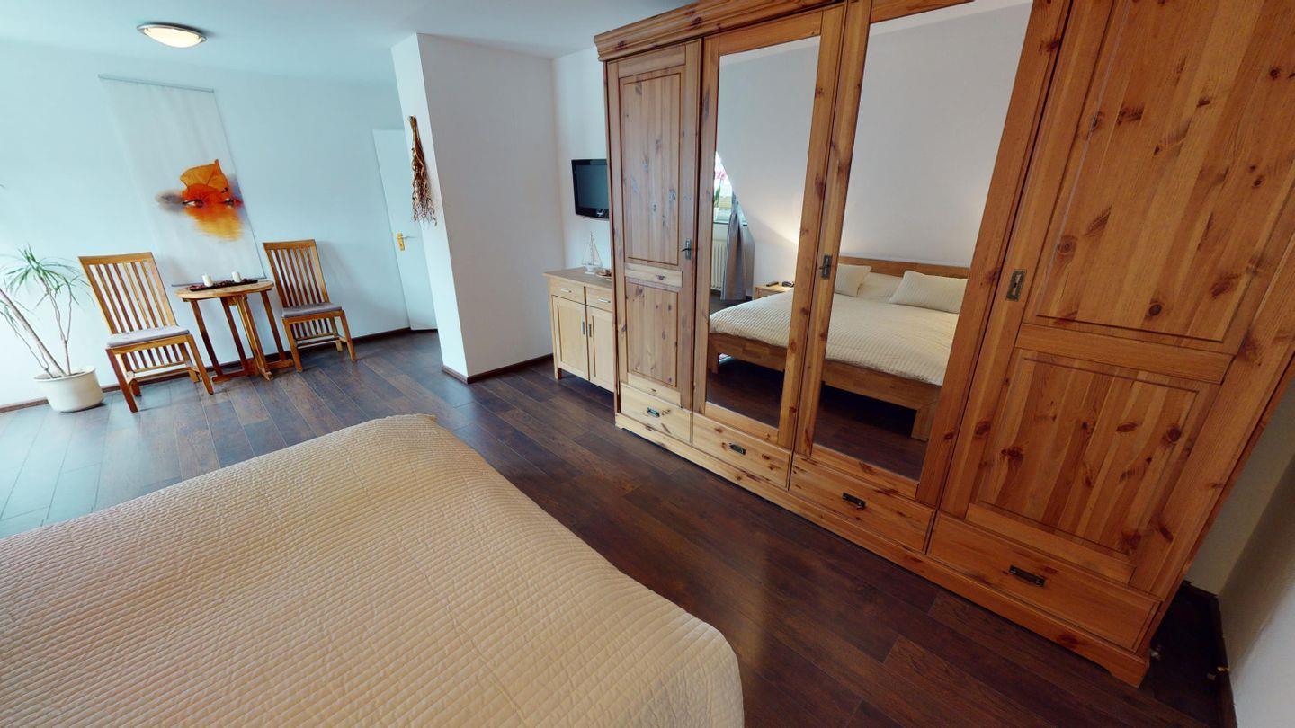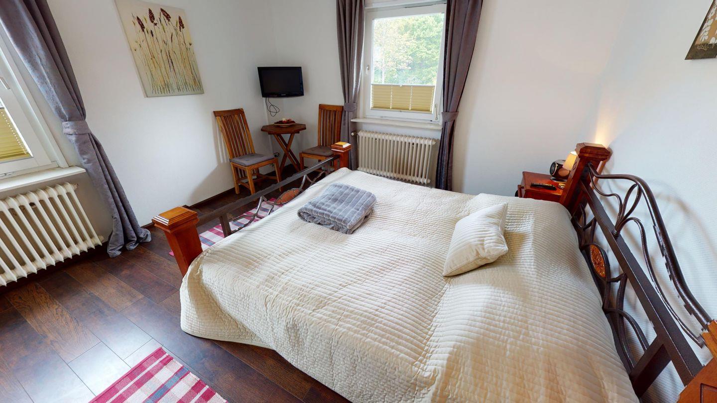 Im Erdgeschoss des Haupthauses befinden sich ein Schlafzimmer mit Doppelbett und ein modernes, barrierearmes Badezimmer mit ebenerdiger Dusche, komfortabel auch für Gäste mit eingeschränkter Mobilität.