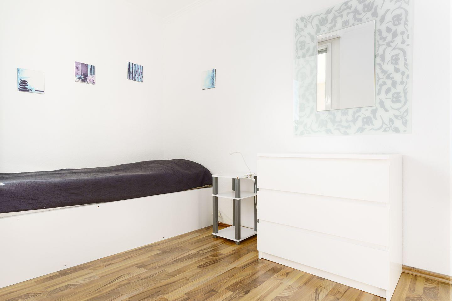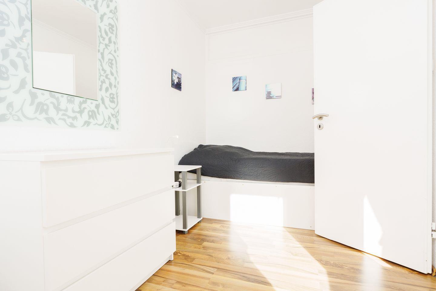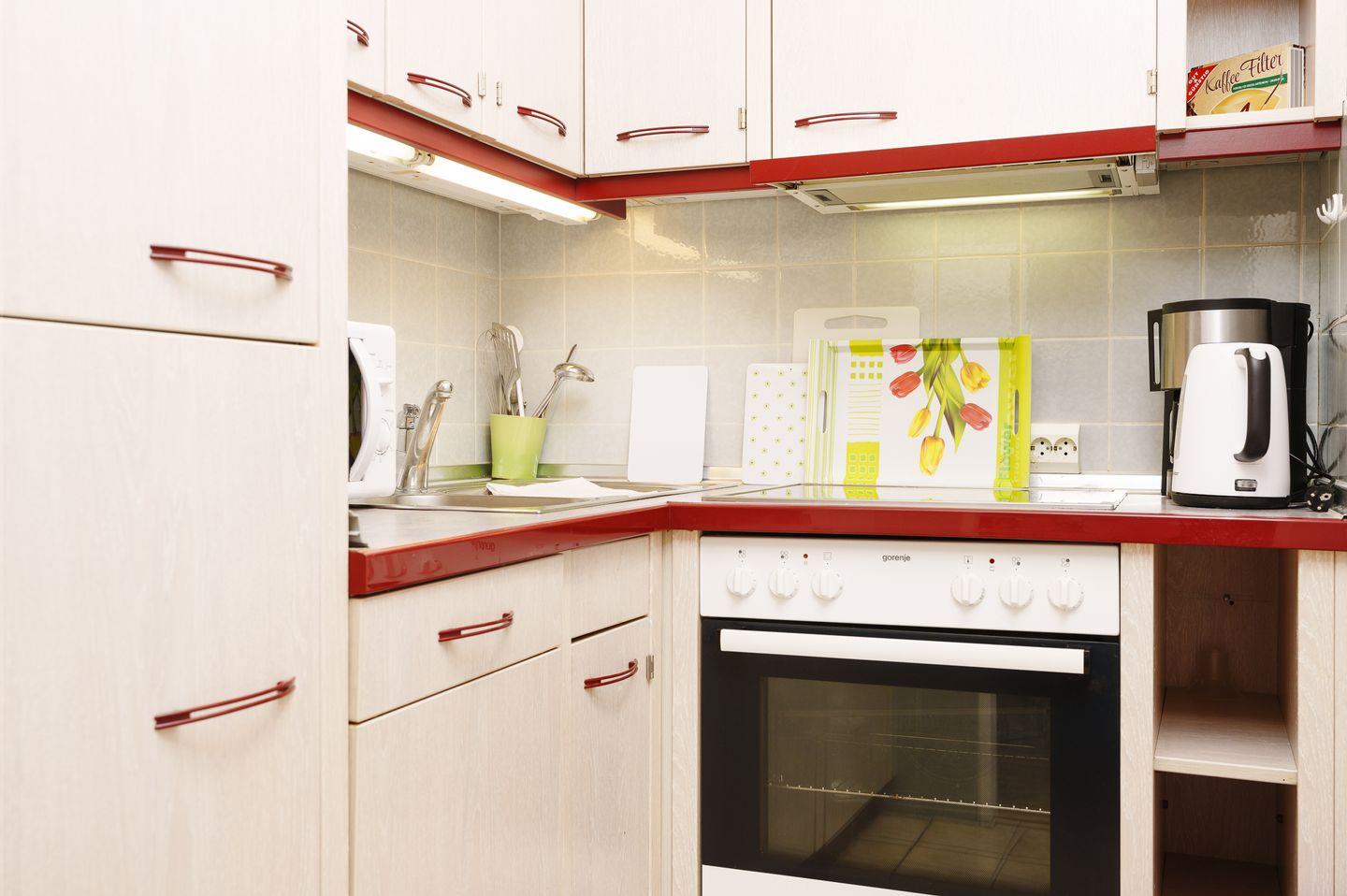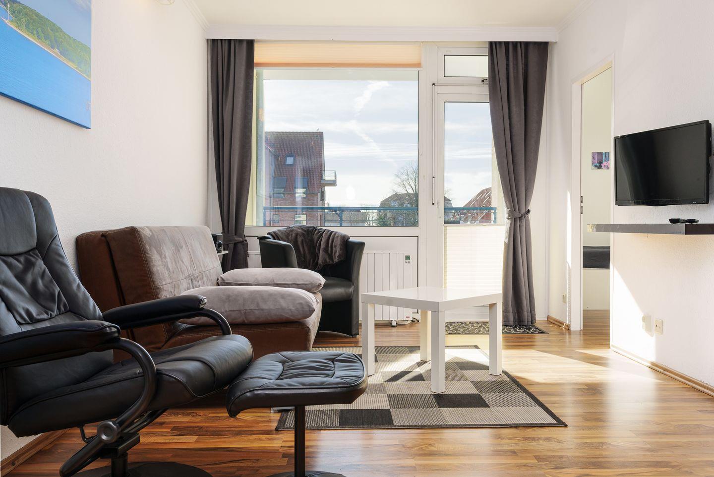 Über den Flur gelangst du in das modern eingerichtete Wohnzimmer mit gemütlicher Sitzgruppe und Schlafsofa. Die kompakte, gut ausgestattete Küche und das separate Schlafzimmer mit Einzelbetten grenzen direkt an den Wohnbereich an und bieten dir alles, was du für einen komfortablen Aufenthalt brauchst.